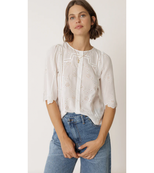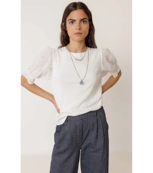 Quick view Añadir a la cesta Lista de deseos Añadir a comparar Camiseta blanca canalé mangas abullonadas bordado suizo INDI&COLD Precio 69,90 € Una camiseta especial que combina un canalé de algodón con mangas abullonadas de voile con bordado suizo. INDI&COLD