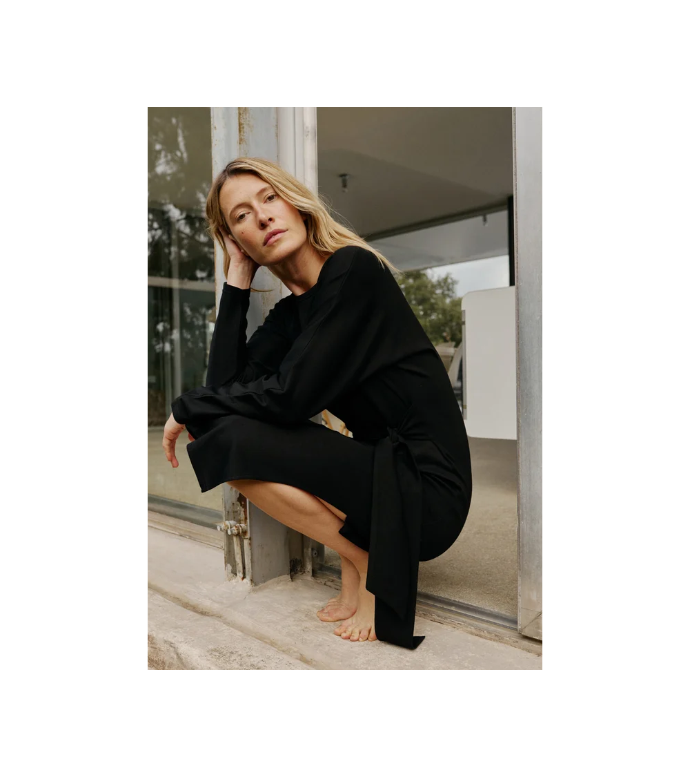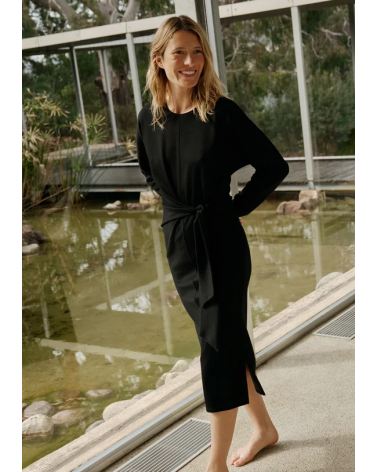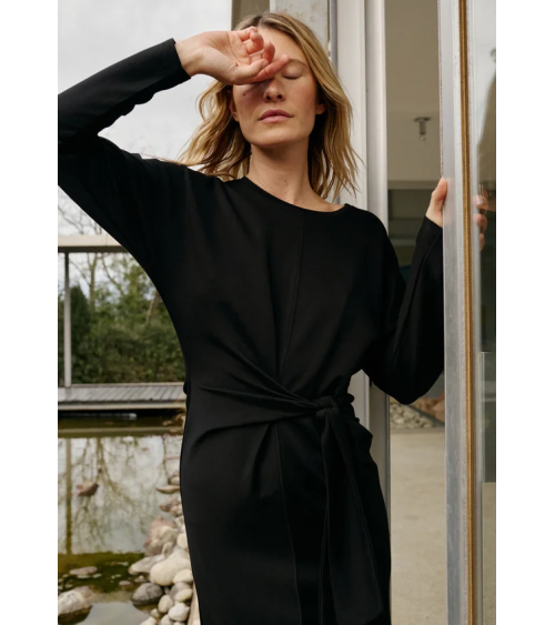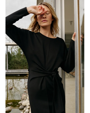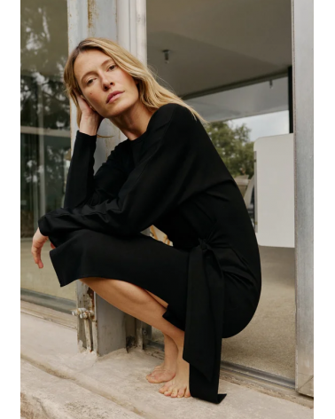 Vestido de punto con mucha caída, se ajusta en la cintura mediante lazada del tejido y tiene abertura en un lateral en color negro Indiandcold.