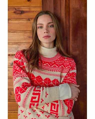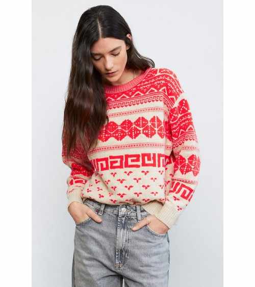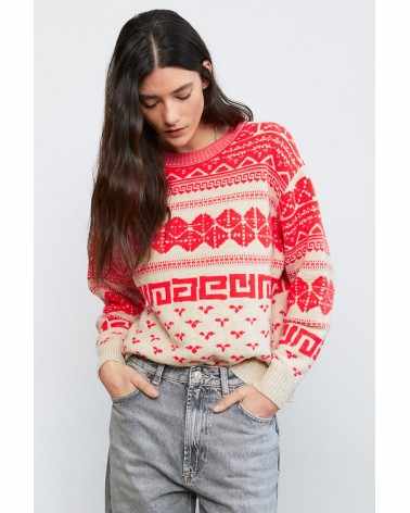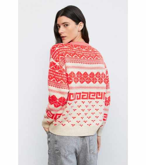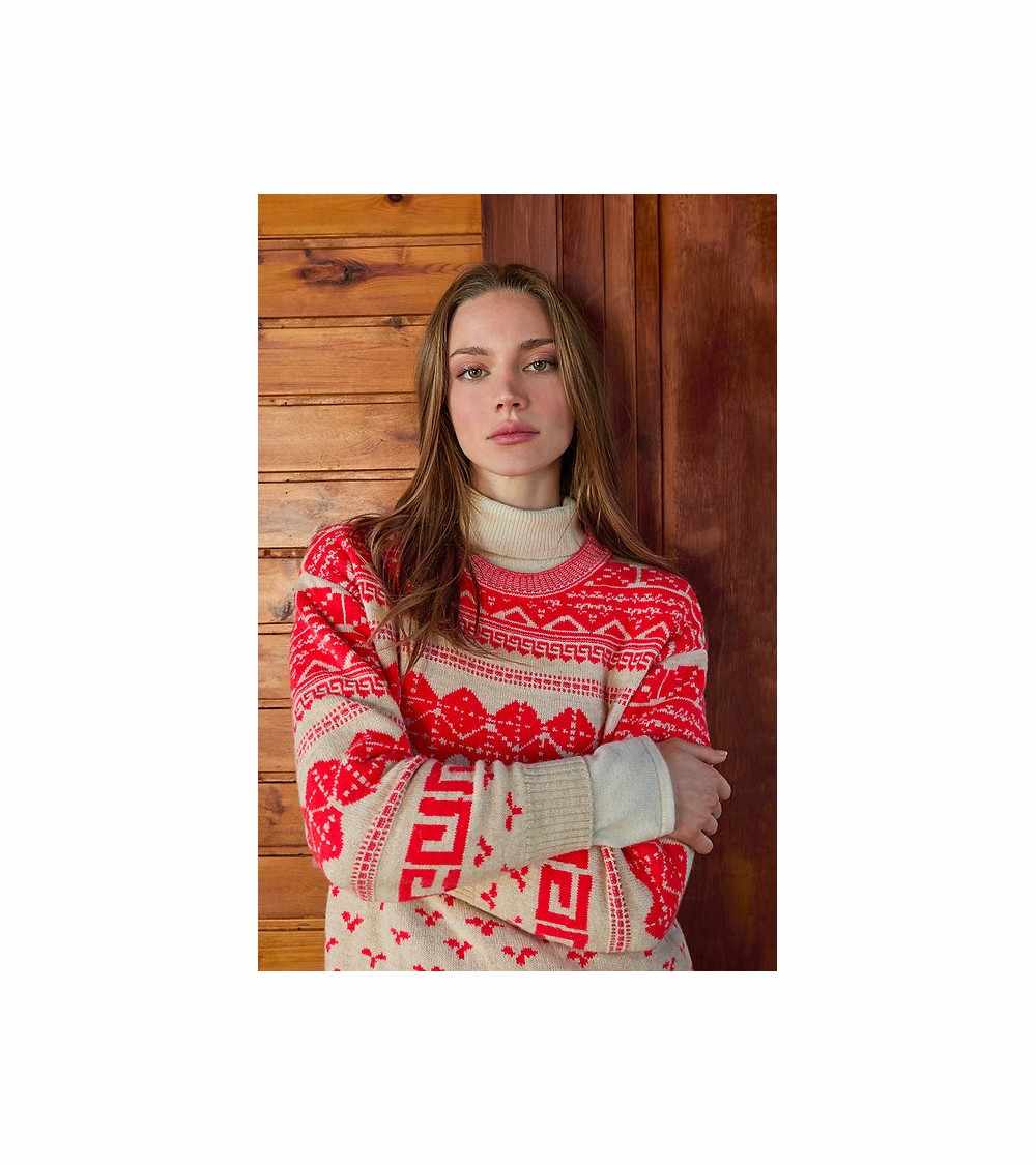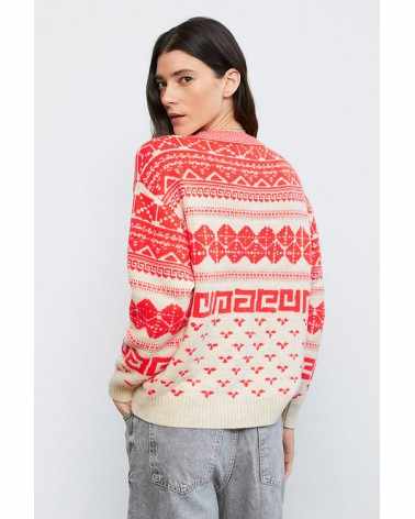 Jersey en cuello redondo con estampado en tonos etnicos en naranjas sobre fondo crudo perfecto para los dias de otoño-invierno por su tejido y su textura Aldo Martins.