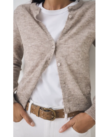 Cárdigan y pañuelo hechos de lana de alpaca. De galga fina. Pañuelo triangular. Cárdigan de cuello caja y fitting entallado. Largo prenda para talla S: 53 cm