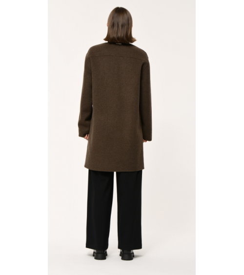 Abrigo y bufanda de mezcla de lana, corte recto ligeramente oversize, escote en pico estructurado, manga larga, cierre con botones cruzados en la parte delantera, bolsillos inclinados en color chocolate el color de moda Humility.