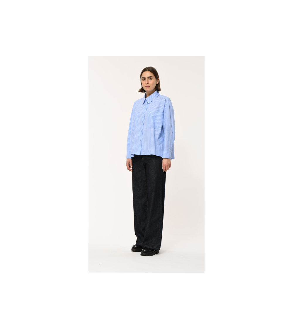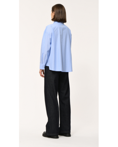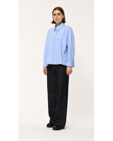 Camisa holgada de algodón con rayas en relieve, dos bolsillos de parche en el pecho, mangas largas, sisa más baja, puños abotonados, detalle de holgura en la abertura lateral, ligeramente más larga espalda redondeada HUMILITY