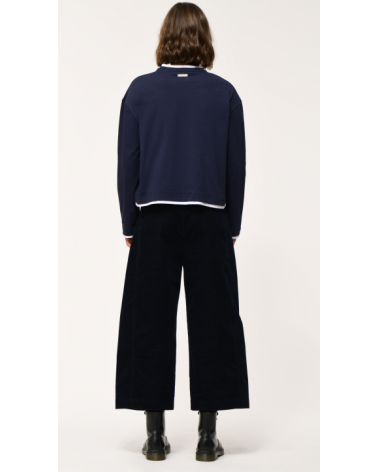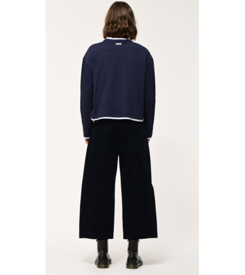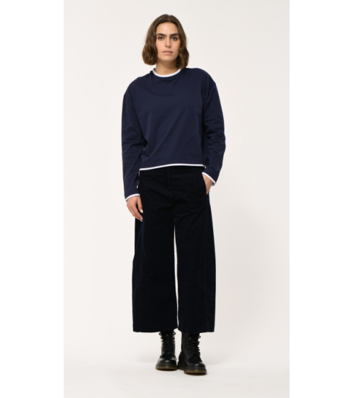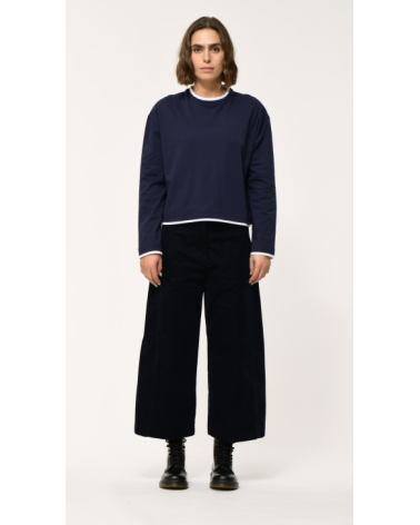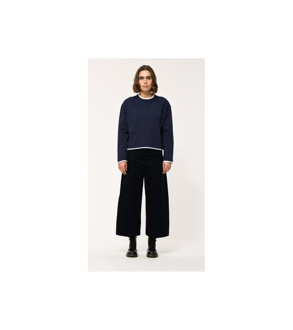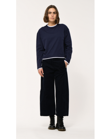 Camiseta de manga larga de algodón orgánico azul marina, cuello redondo, corte recto, acabado con doble borde en contraste en escote, bajo de mangas y cuerpo Humility.