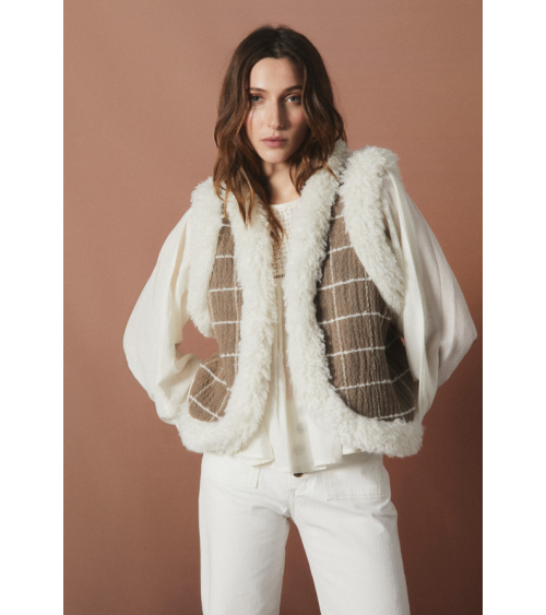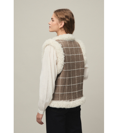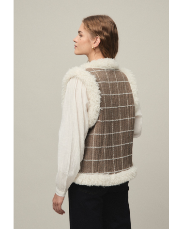 Chaleco topo y crudo cuadros corte recto detalle pelo sisas escote bajo MI&CO