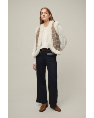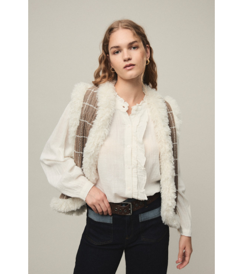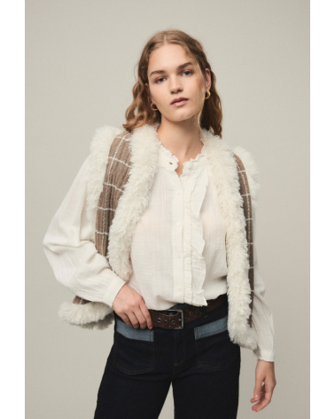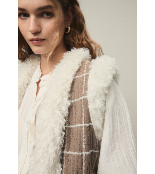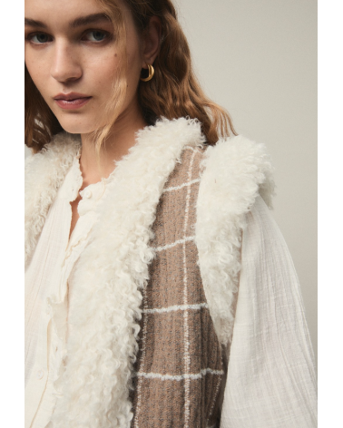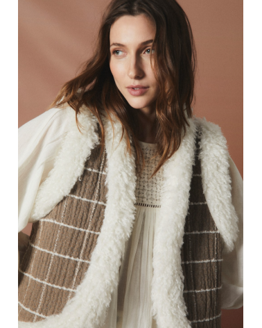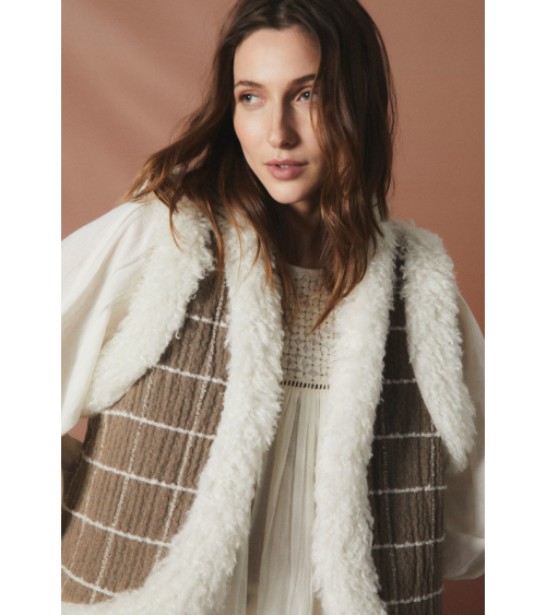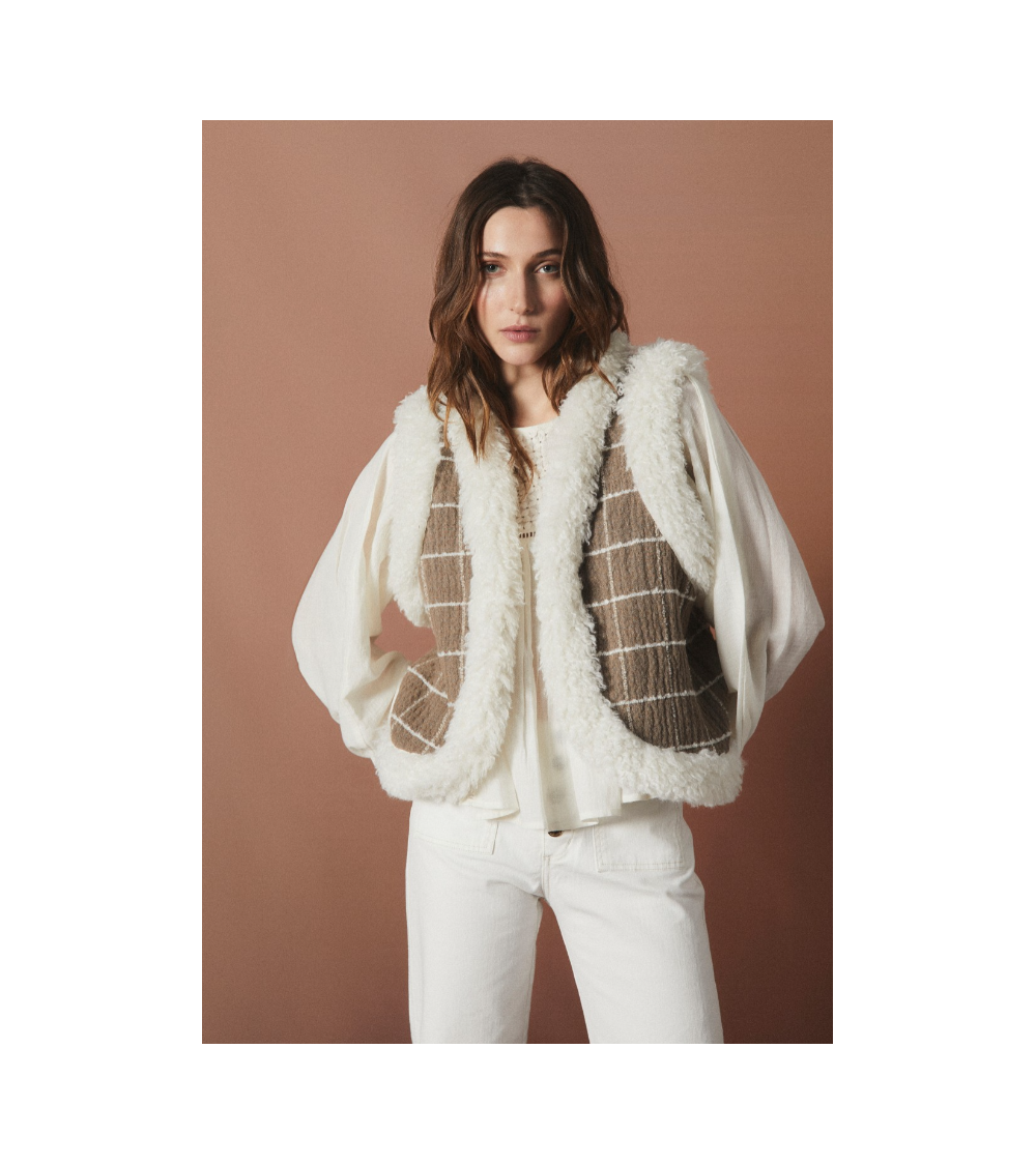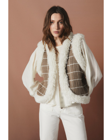 Chaleco de cuadros de corte recto. Confeccionado con detalle de pelo en sisas, escote y bajo de MI&CO
