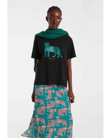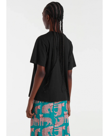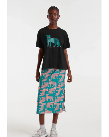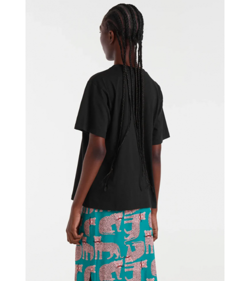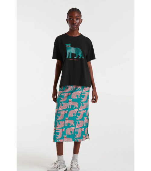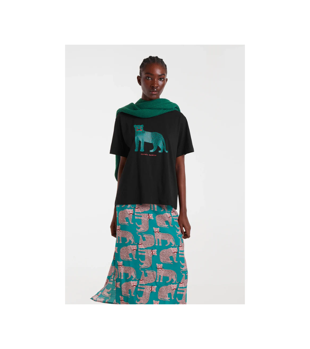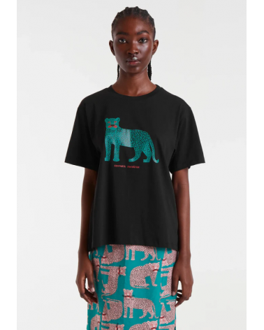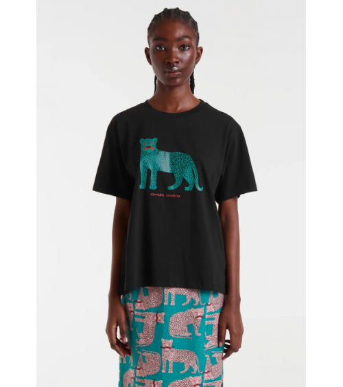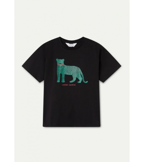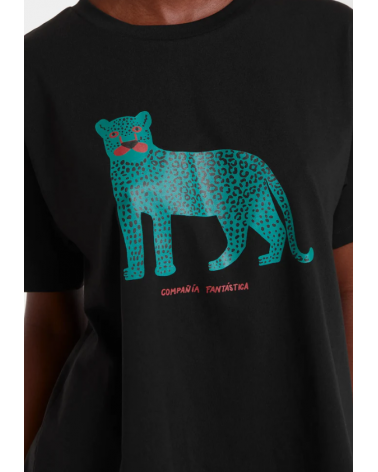 Camiseta de tejido 100% algodón de color negro con print de puma. Cuello redondo y manga corta. Hombro ligeramente caído. La modelo mide 178 cm y lleva la talla S COMPAÑÍA FANTÁSTICA