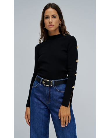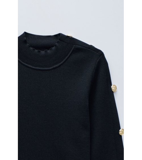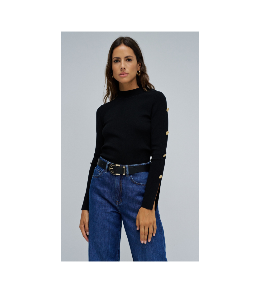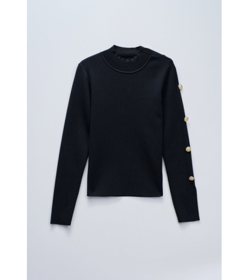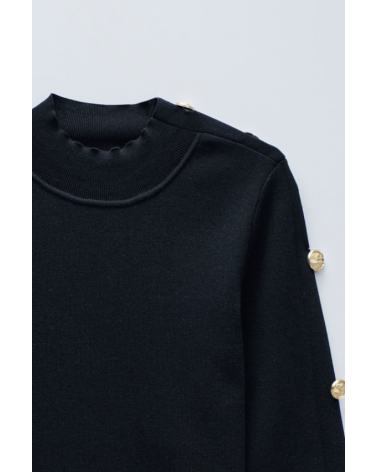 Jersey de punto en color negro, de corte slim que realza la silueta. Con cuello vuelto y manga larga, se distingue por los botones decorativos en los hombros y en las mangas, un detalle elegante que aporta modernidad a la prenda.