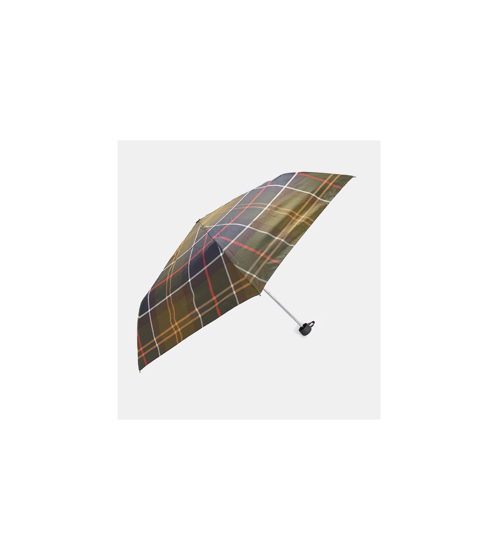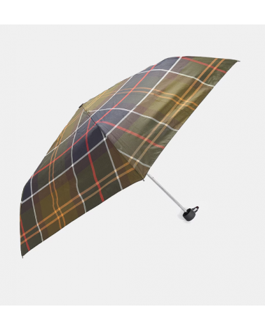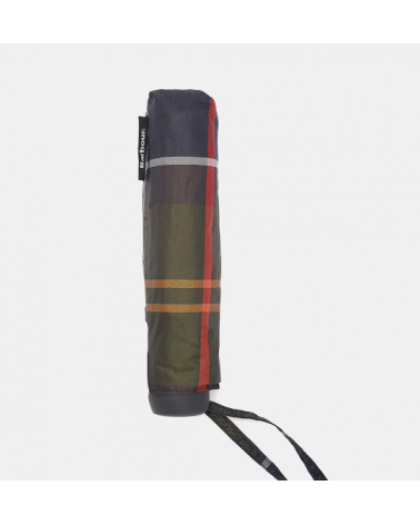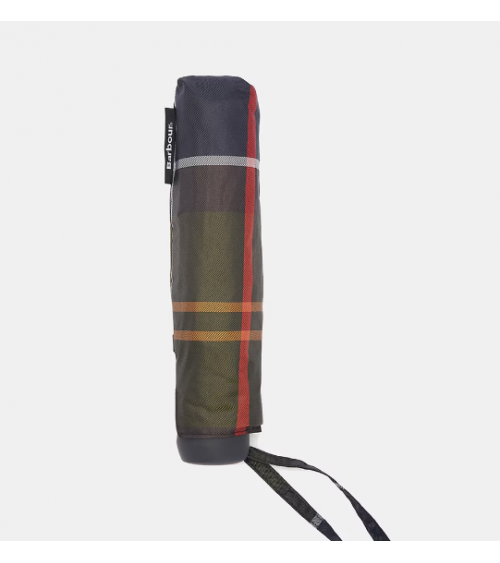 Paraguas plegable automático del tamaño de un bolso de mano que presenta un diseño telescópico con un diseño de tartán característico de Barbour en el dosel.