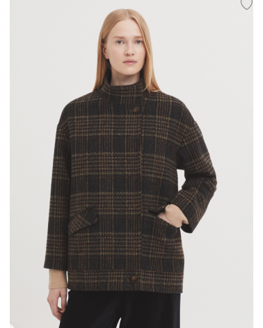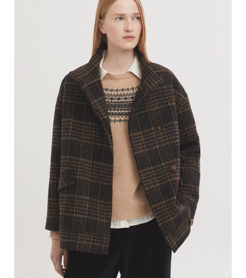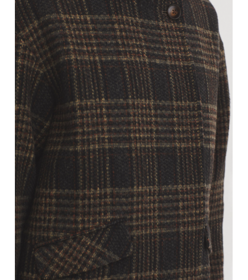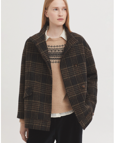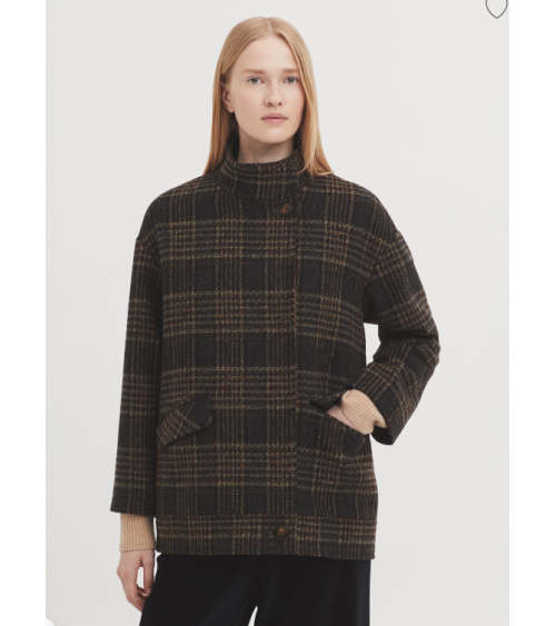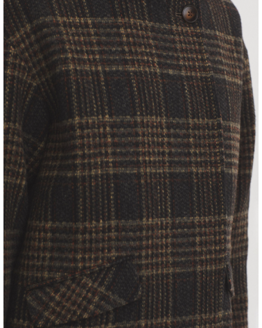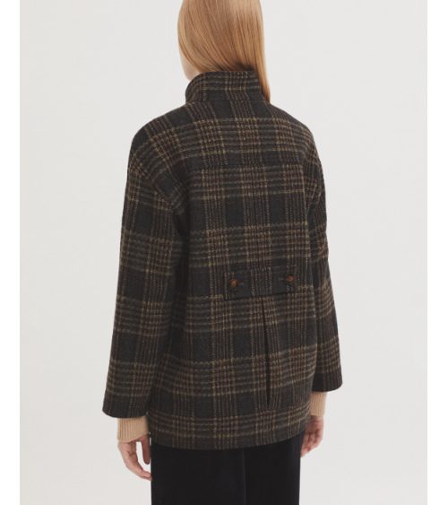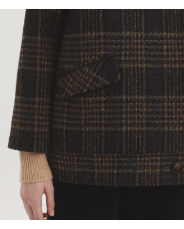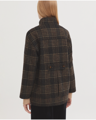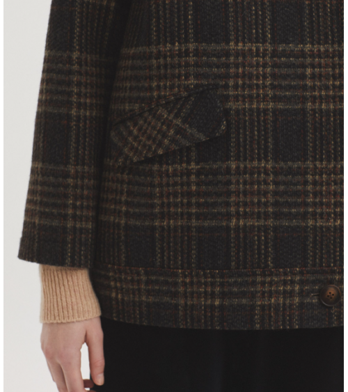 Chaquetón en tejido de cuadros mezcla de lana. Cuello alto y bolsillos con tapetas. Cierre con botones exteriores e interiores. Espalda con canesú, fuelle y tira con botones. Forrado NICE THINGS