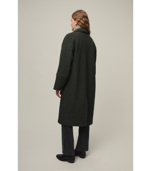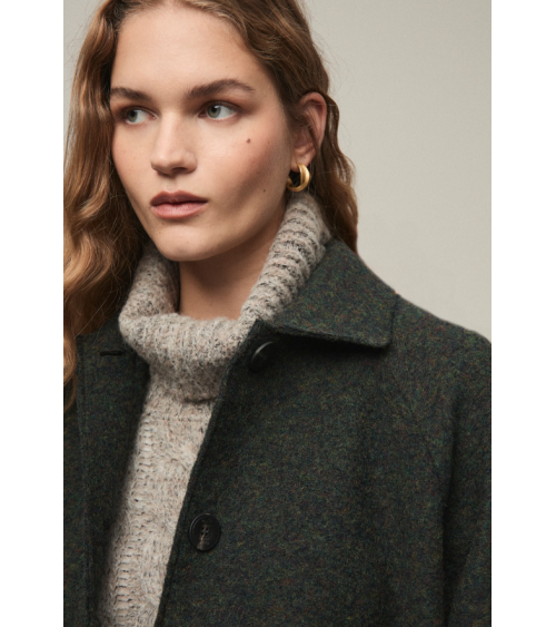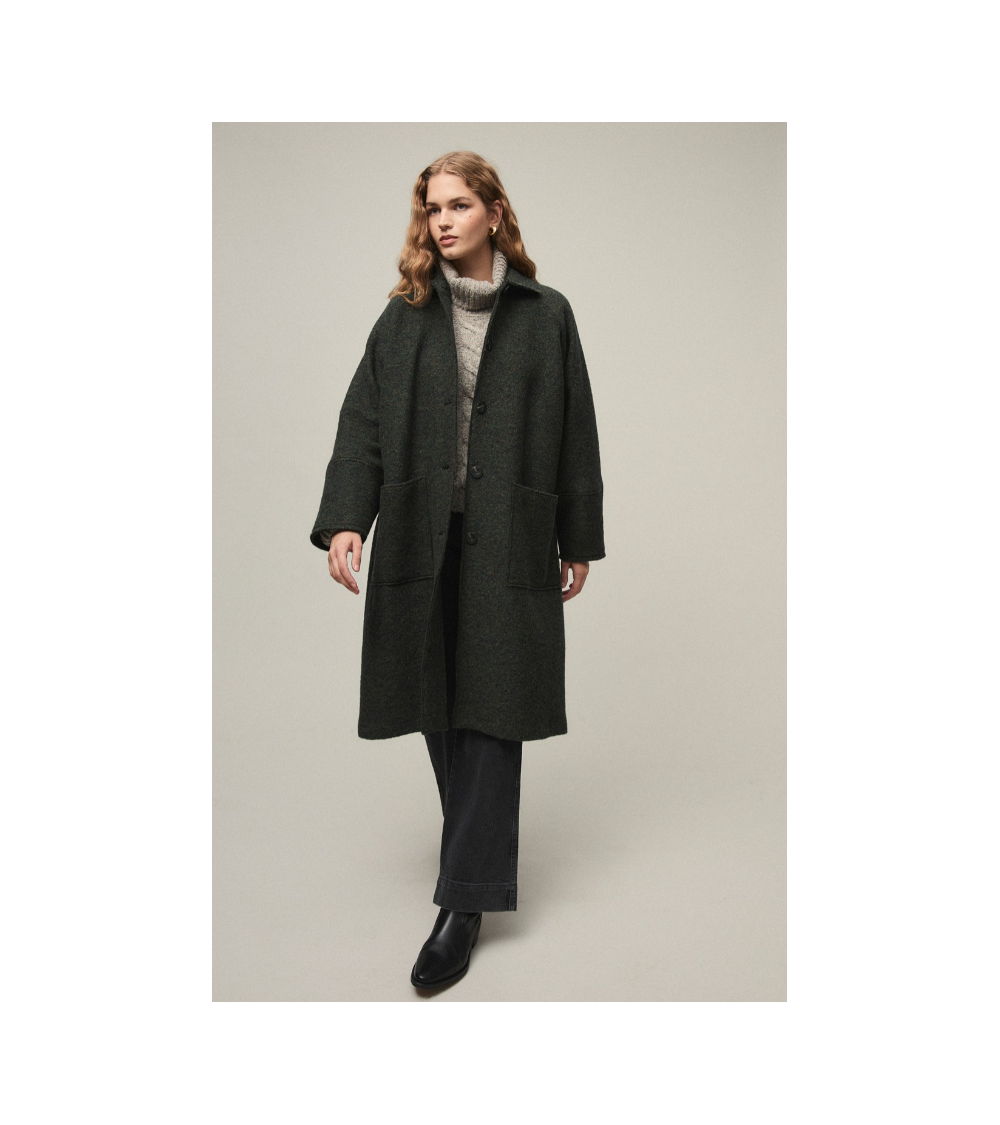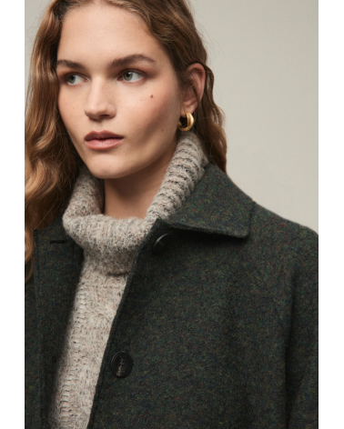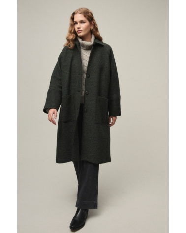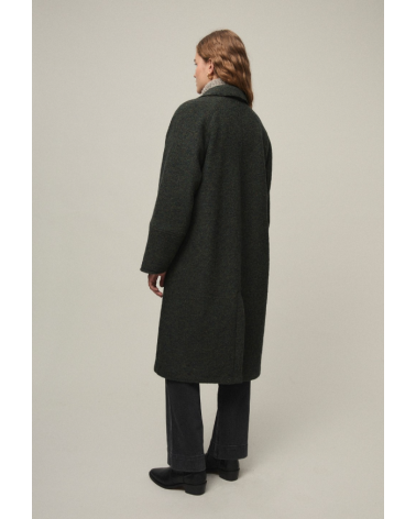 Abrigo largo de lana estilo gabardina. Cuello solapa, abotonadura central y bolsillos en delantero.