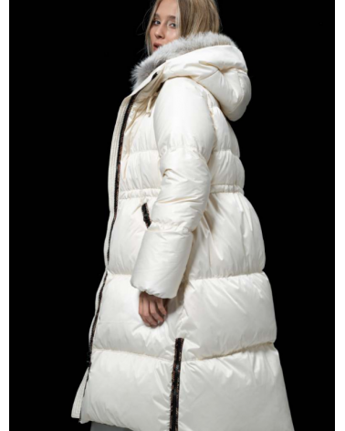 Abrigo crudo de plumón encapsulado con pelo de zorro en la capucha ribete a contraste efecto serpiente de FLO-CLO