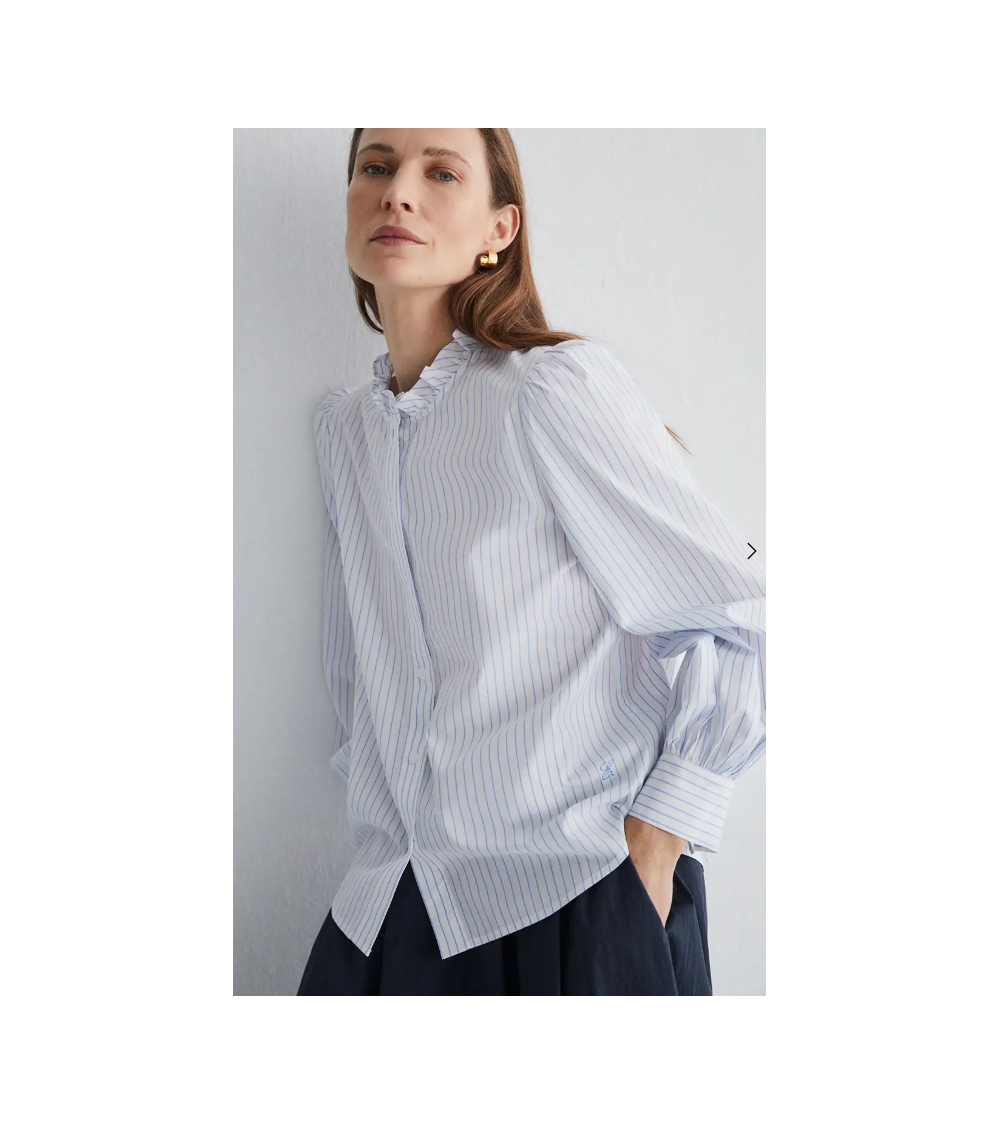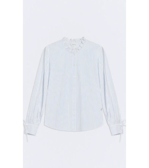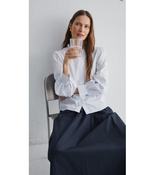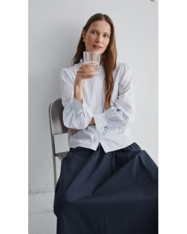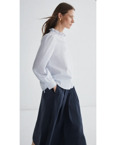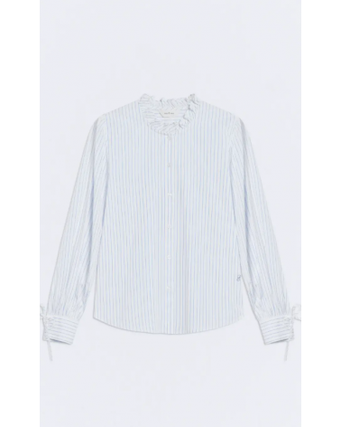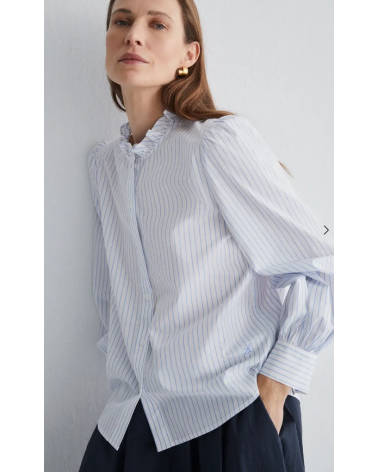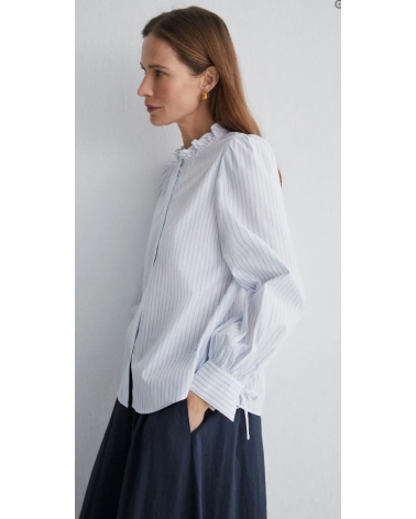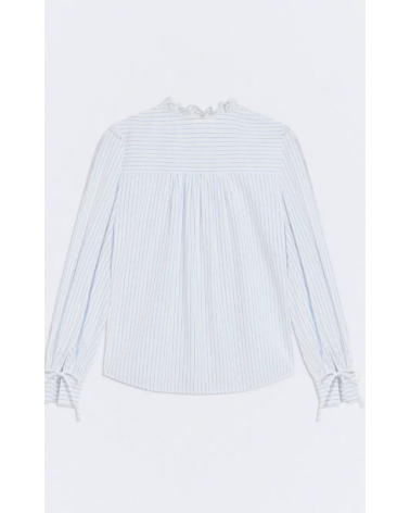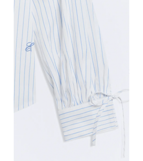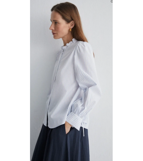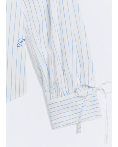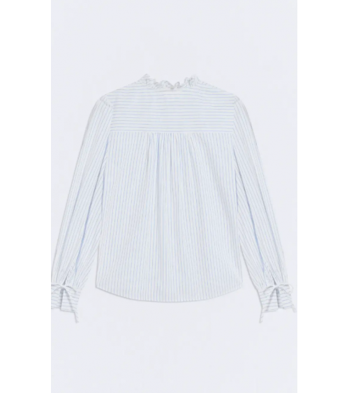 Camisa blanca y azul de raya diplomática en tejido de algodón con detalles lazos en los puños y volante en el cuello de ESEOESE