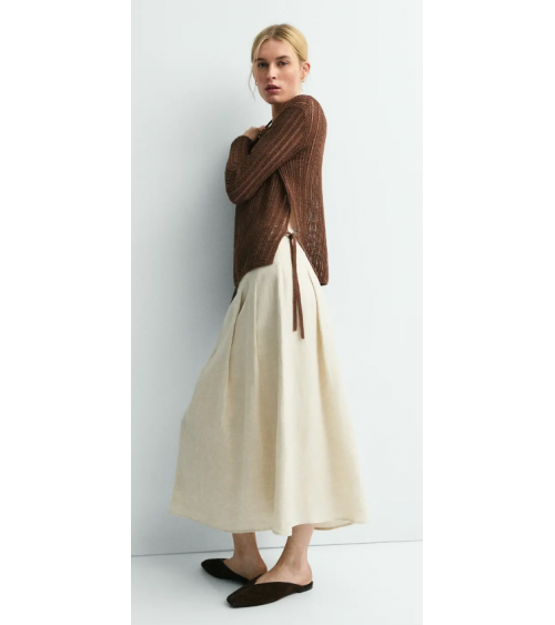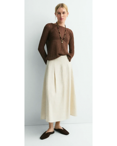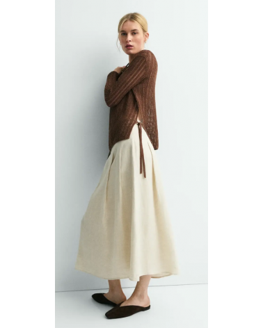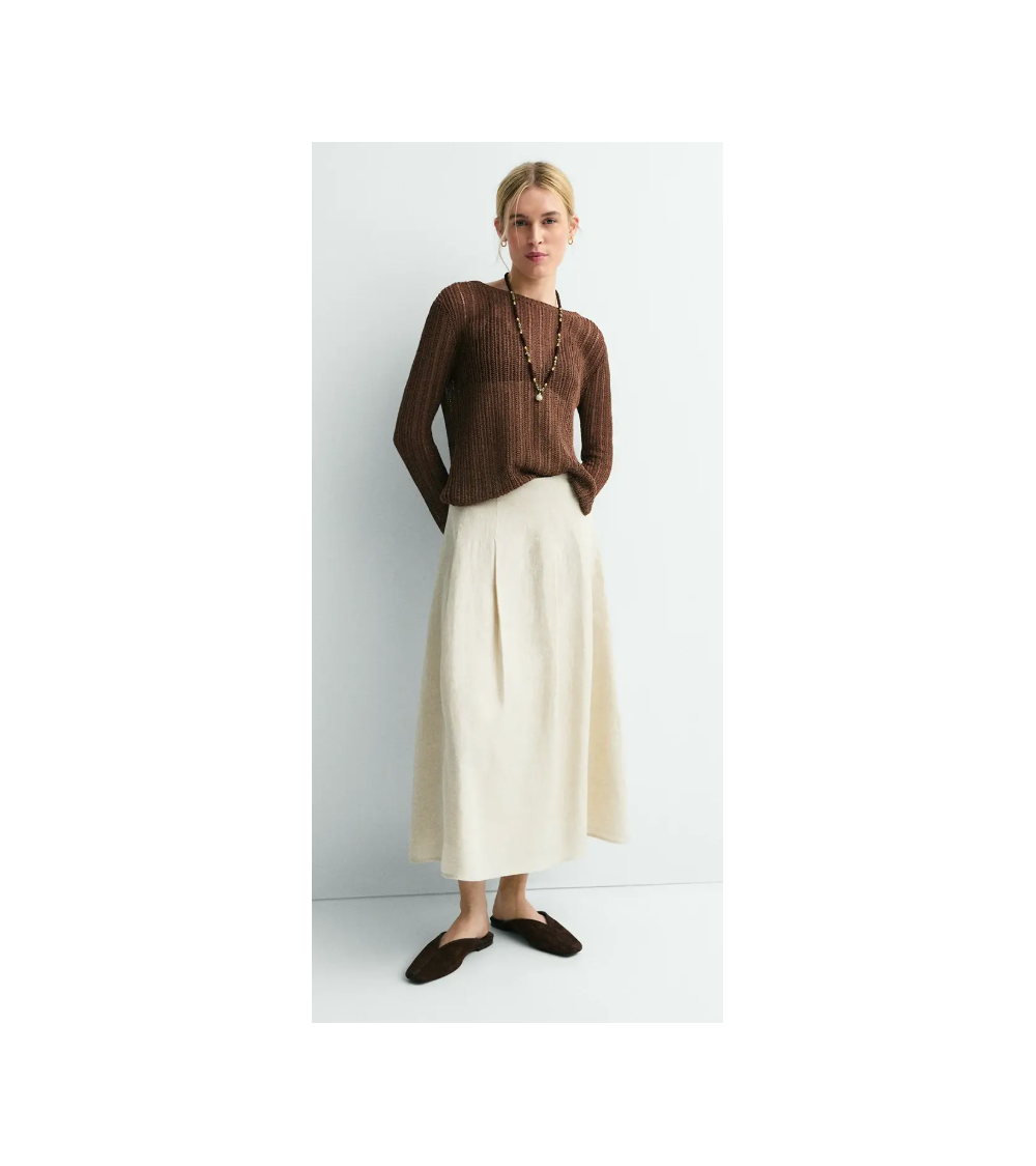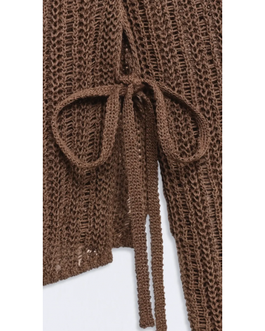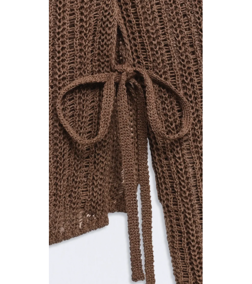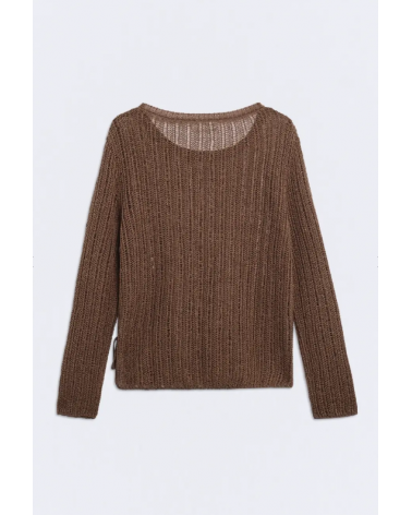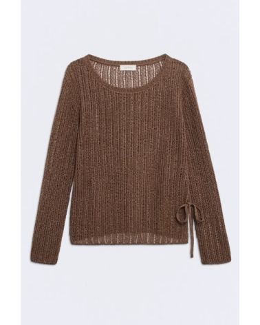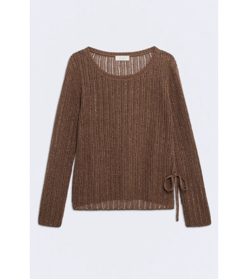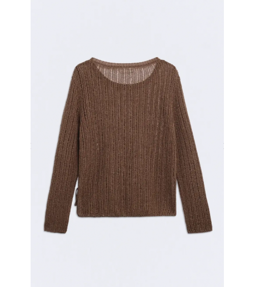 Jersey confeccionado con mezcla de lino y algodón en color cacao, tejido con estructura calado y cuello redondo.