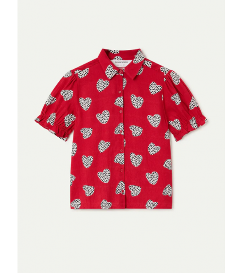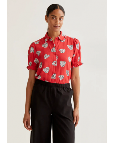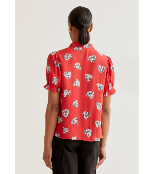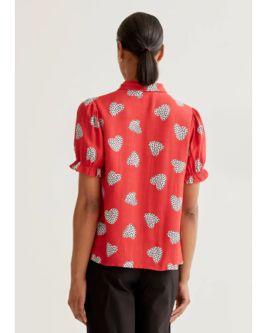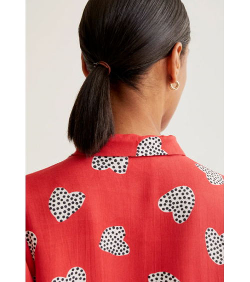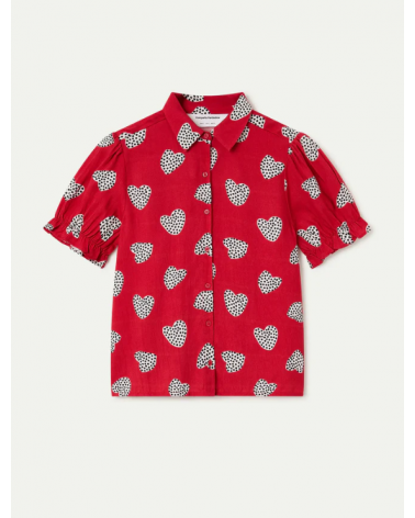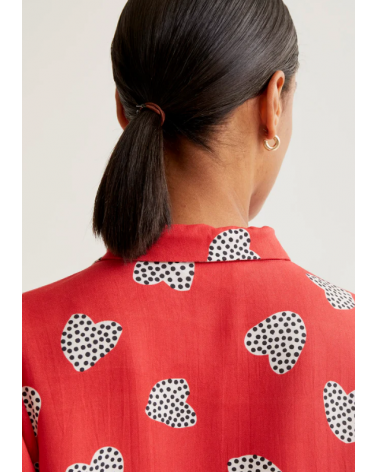 Camisa con estampado harmony roja. Cuello con solapa y manga corta ligeramente abullonada con detalle de volantes. Cierre frontal con botones de color rojo.