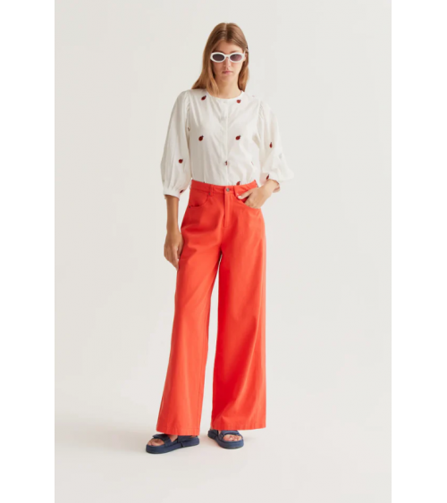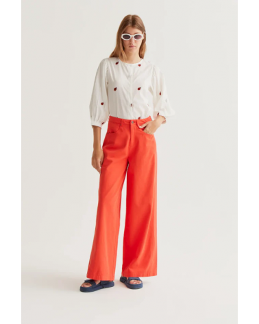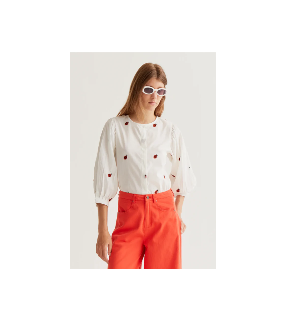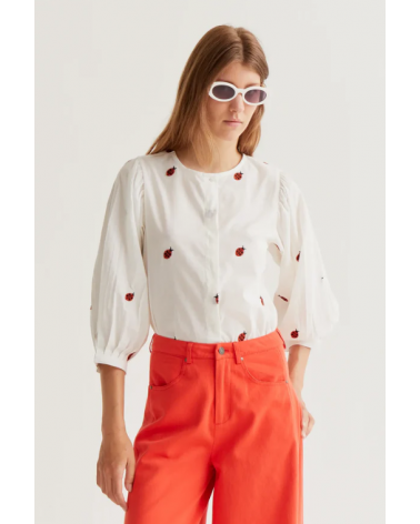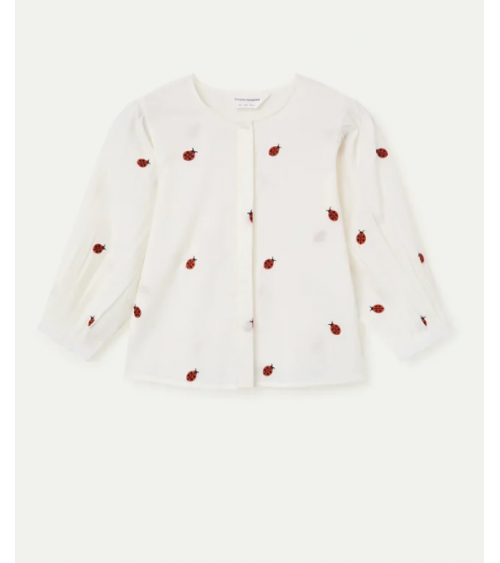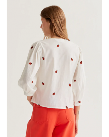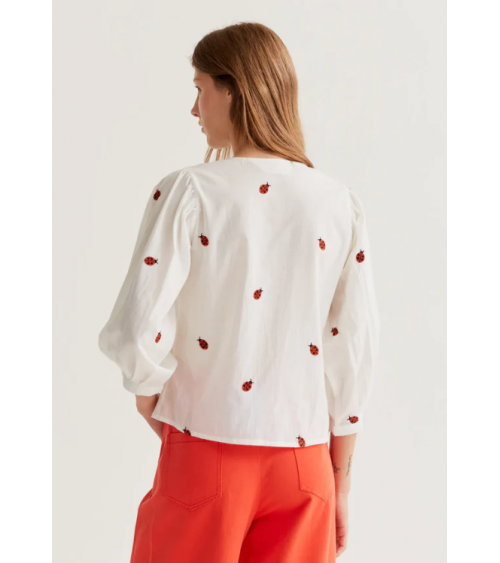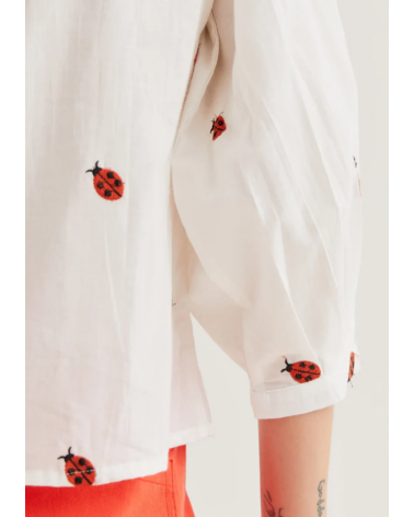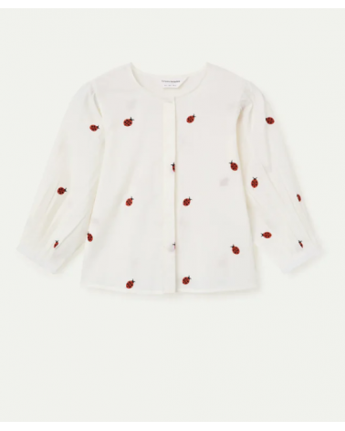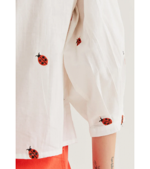 Blusa de tejido 100% algodón de color blanco con estamado mariquitas. Cuello redondo y manga larga ligeramente abullonada. Cierre frontal con botones de color blanco.