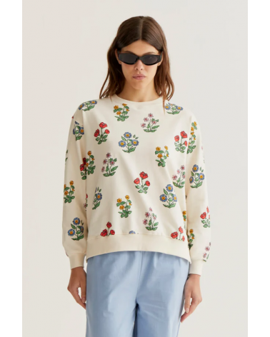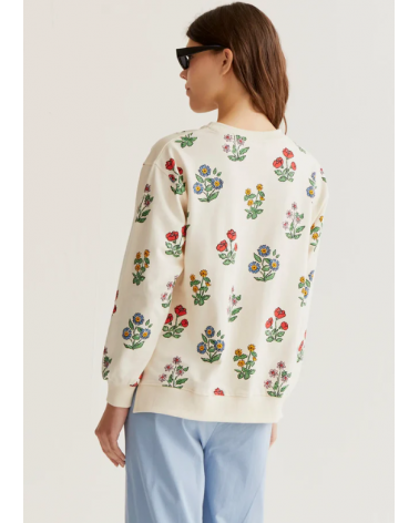 Sudadera de color crudo con estampado de flores. Cuello redondo y manga larga.