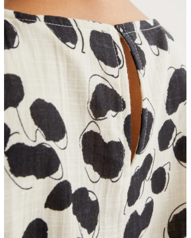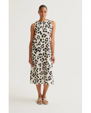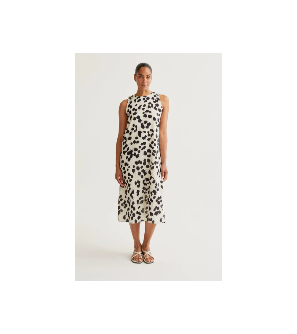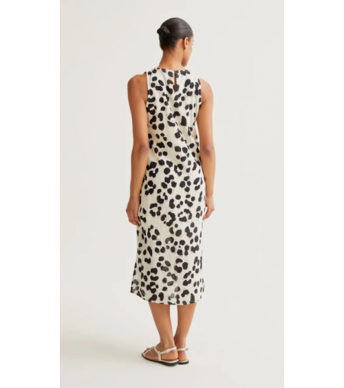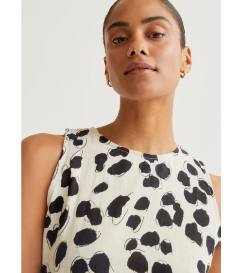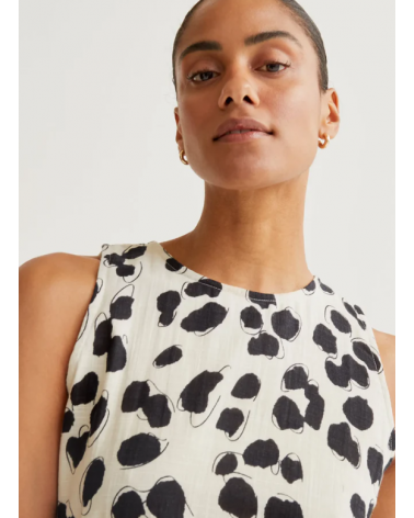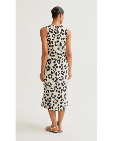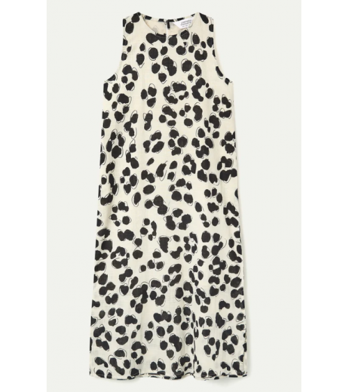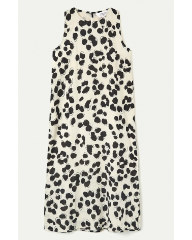 Vestido midi de tejido 100% algodón con estampado dálmata. Cuello redondo y sin mangas. Cierre posterior con botón oculto.