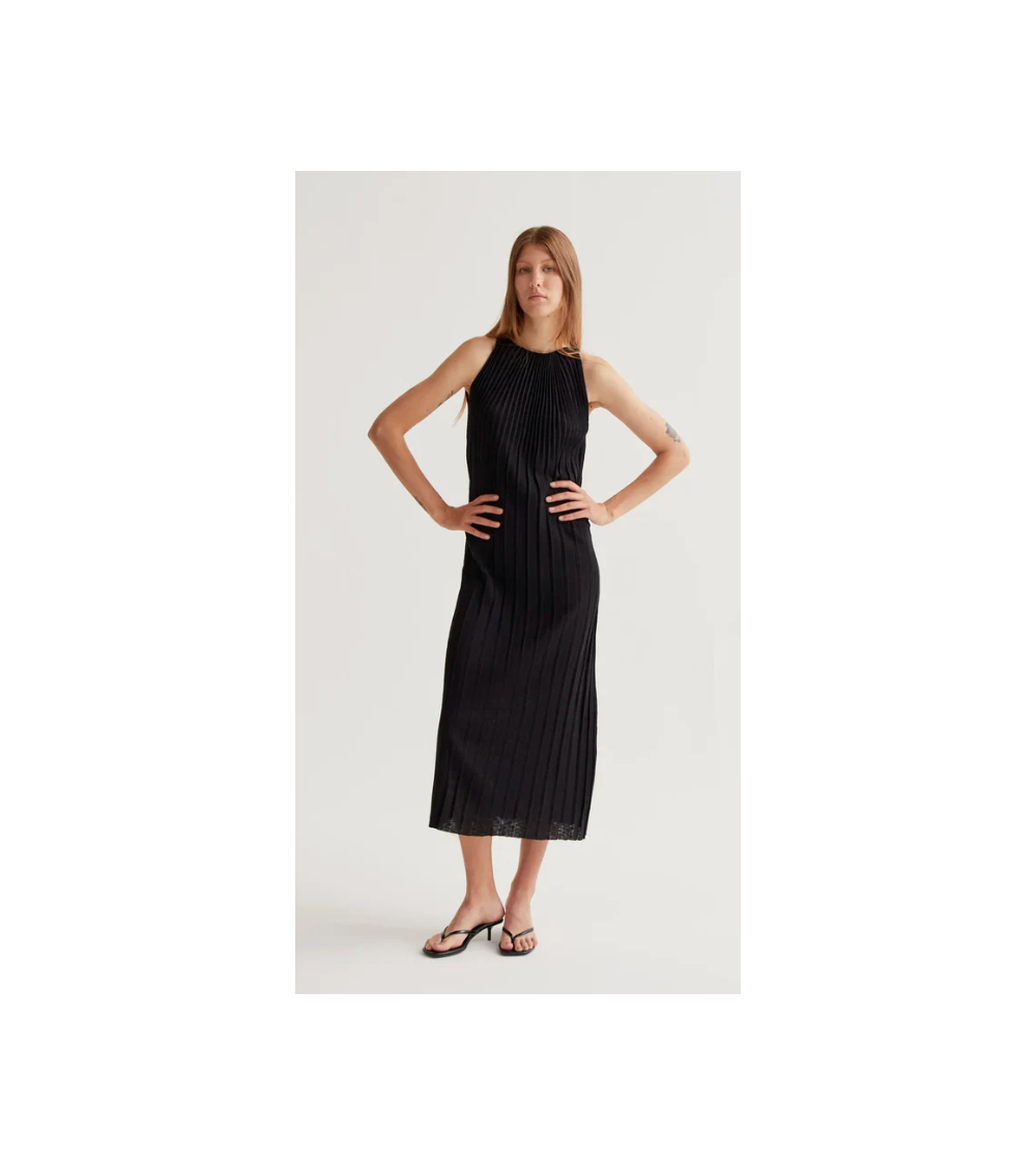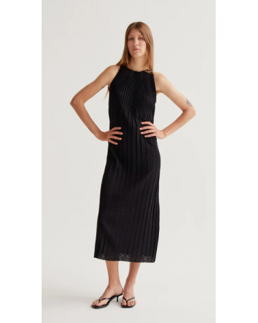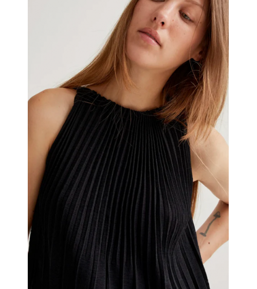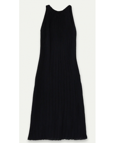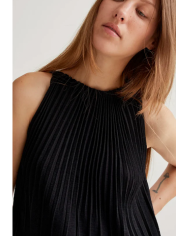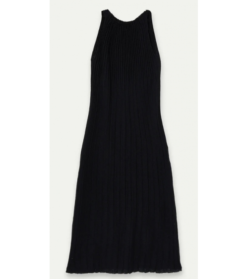 Vestido largo con tejido de punto plisado de color negro. Cuello halter y sin mangas.