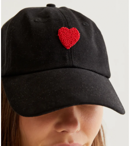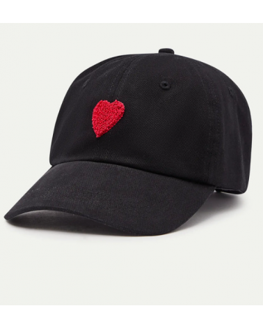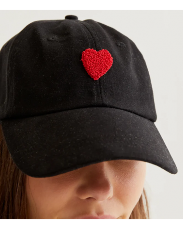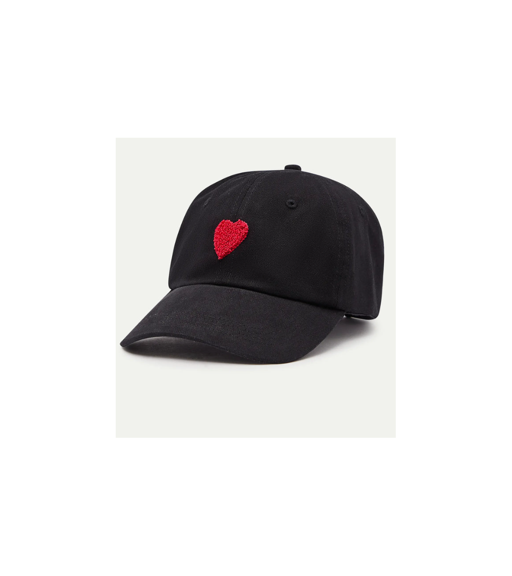 Gorra de tejido 100% algodón de color negro con bordado de corazón de color rojo. Cierre en la parte trasera ajustable con velcro. COMPAÑÍA FANTÁSTICA