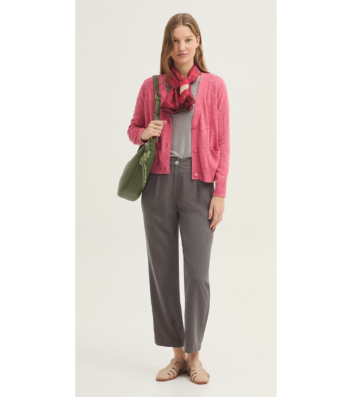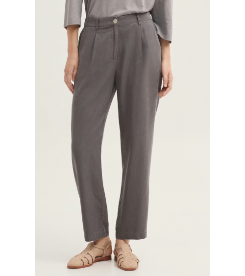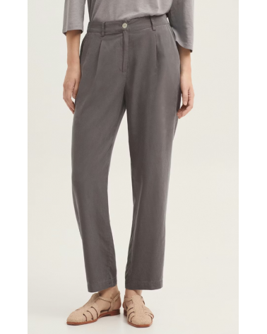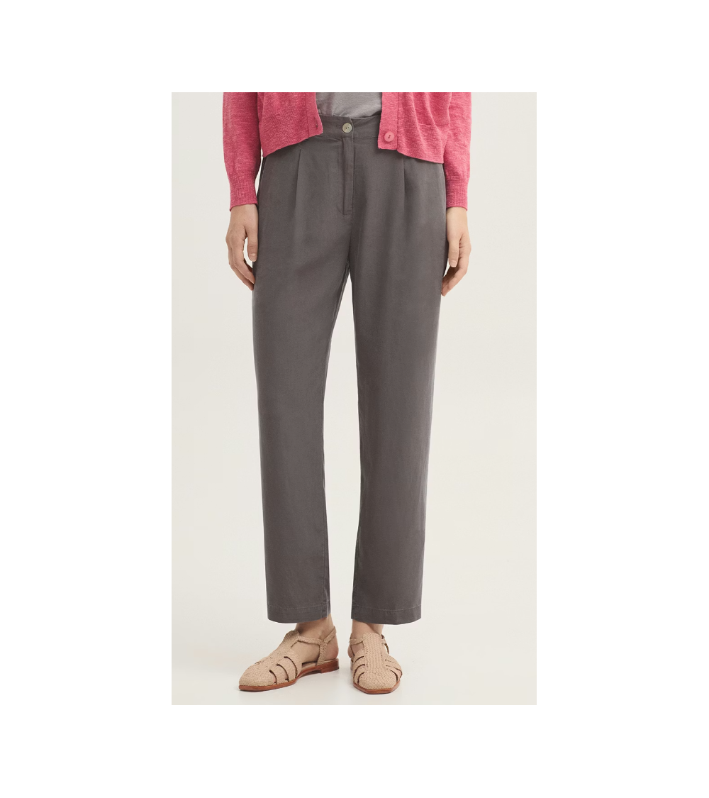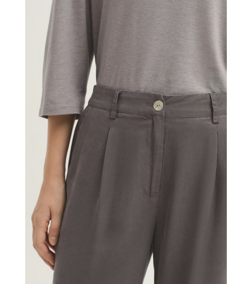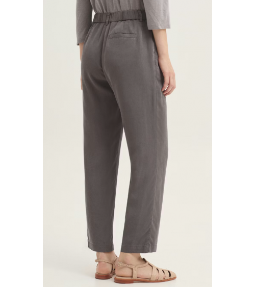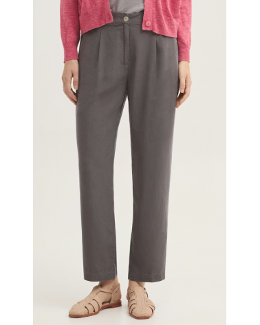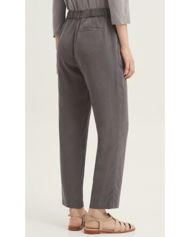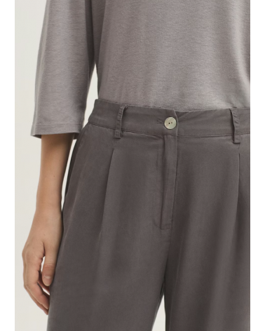 Pantalón confeccionado en tejido Tencel sobretintado. Dispone de bolsillos delanteros, cierre frontal con cremallera y botón de nácar. Cinturilla con trabillas, goma interior en la parte trasera y bolsillo de vivo posterior.