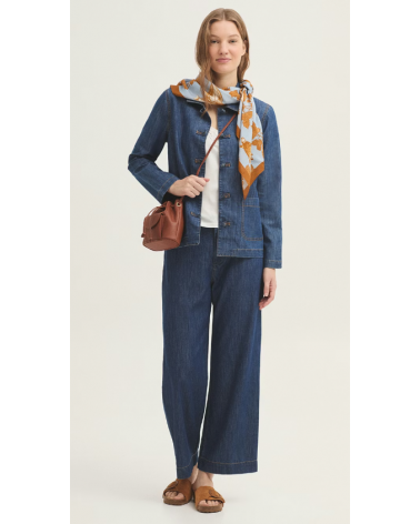 Pantalón tejano confeccionado en algodón sostenible. Presenta bolsillos redondeados en la parte delantera, cierre frontal con cremallera metálica y botón de coco. NICE THINGS