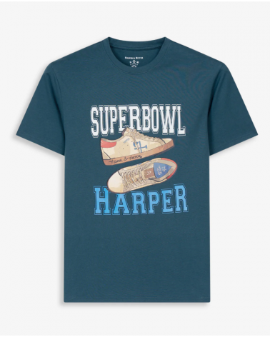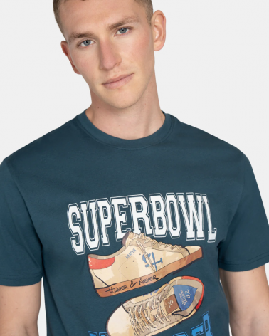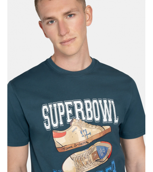 Camiseta blanca de manga corta y cuello redondo. Print en el pecho de zapatilla con letras "SUPERBOWL".
