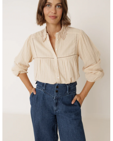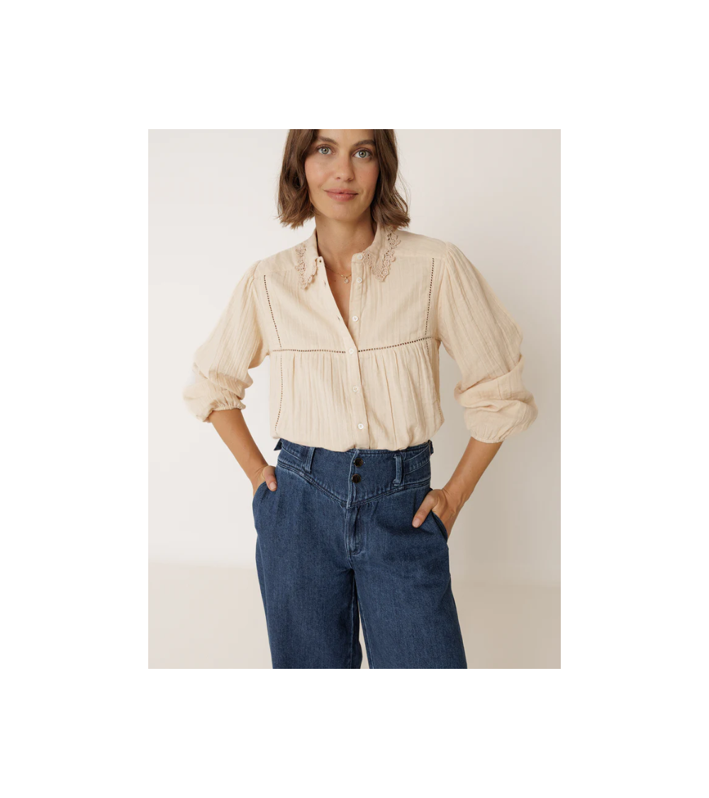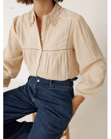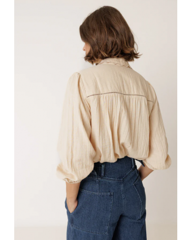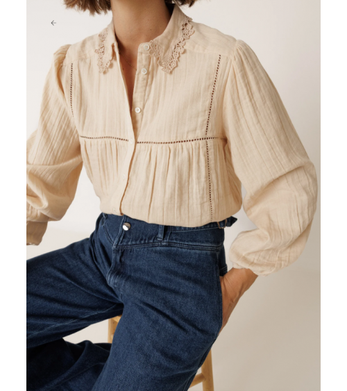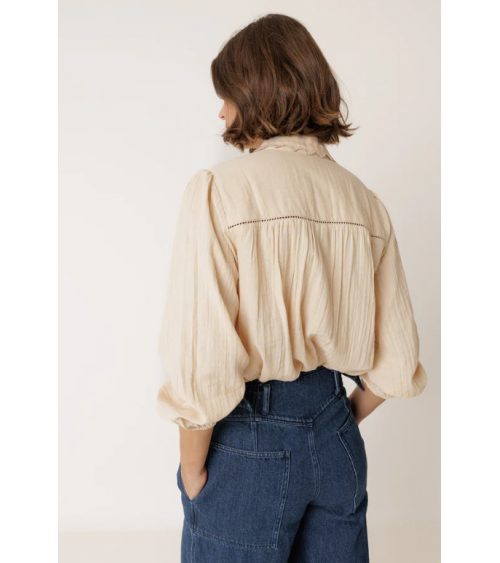 Esta camisa nos encanta porque su cuello de crochet es muy delicado. Además también tiene unas vainicas insertadas. El tejido es de algodón de doble gasa, perfecto para el entretiempo.