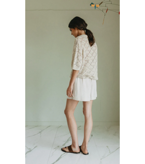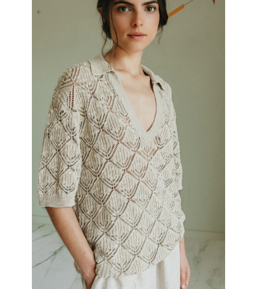 Este polo en tejido de punto con remates en canalé, combina comodidad y estilo. El tejido es de punto de fantasía de algodón con lino con cuello en V.