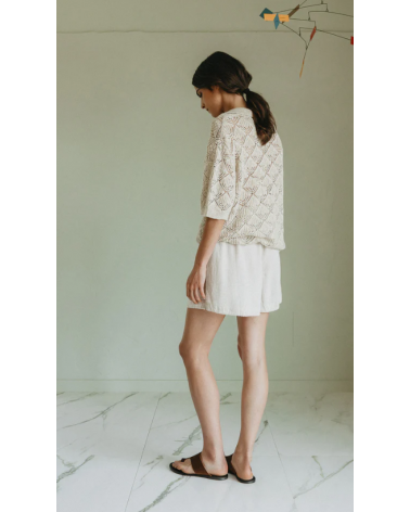 • Hombro ligeramente caído y manga corta con remate en canalé.