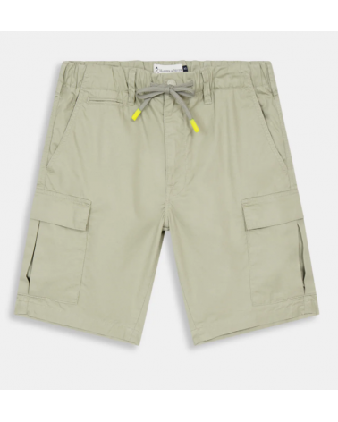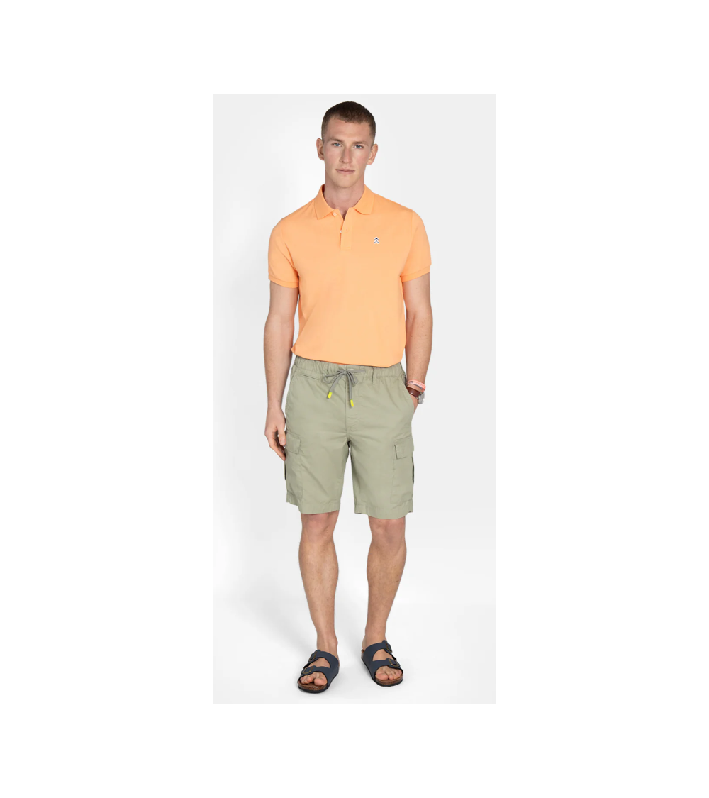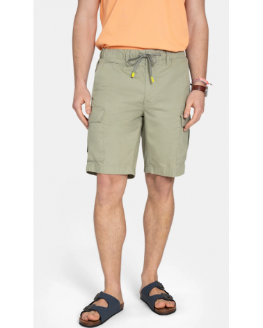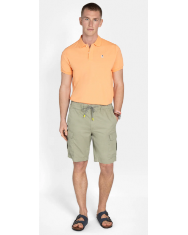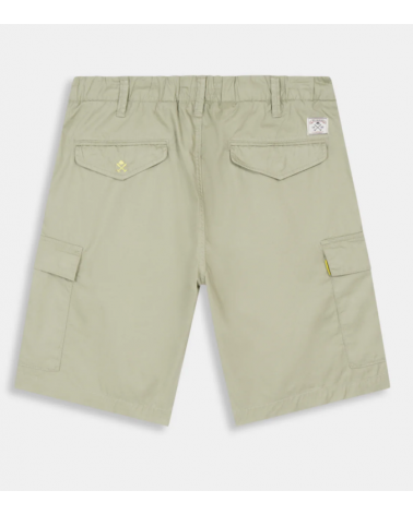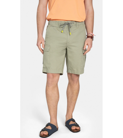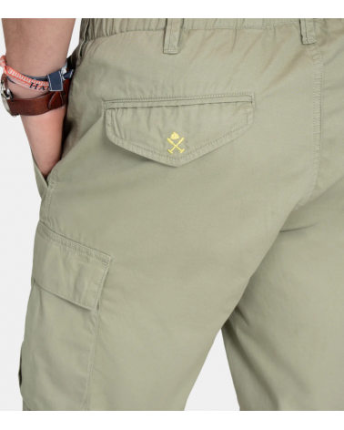 Bermuda en color kaki con tejido de sarga de algodón con elastano; flexible, resistente y con caída impecable. Estilo cargo funcional; bolsillos laterales con solapa.