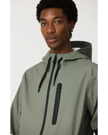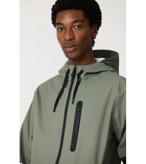 Informal y práctica, esta chaqueta impermeable de poliuretano presenta todas las costuras selladas, una cremallera impermeable en la parte delantera y el bolsillo del pecho. Con corte recto, será tu mejor compañero en la ciudad y en la naturaleza. El tallaje es normal. El modelo usa la talla M