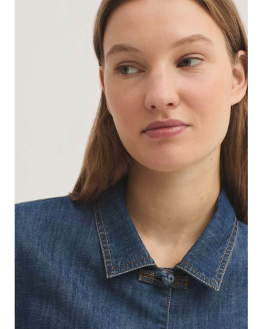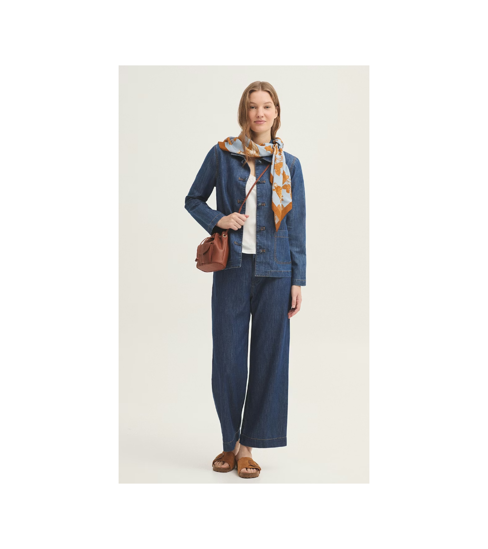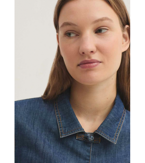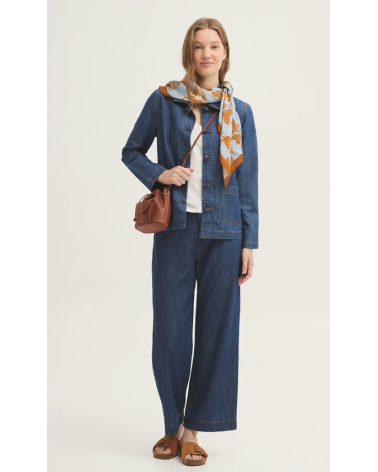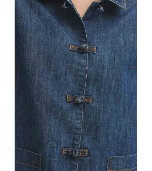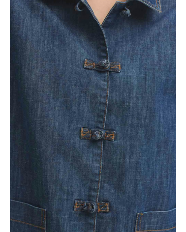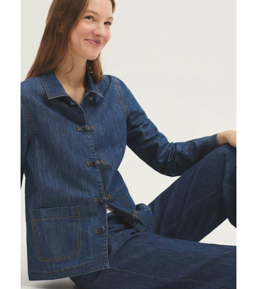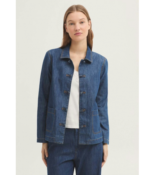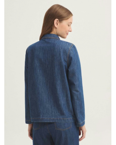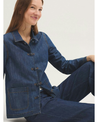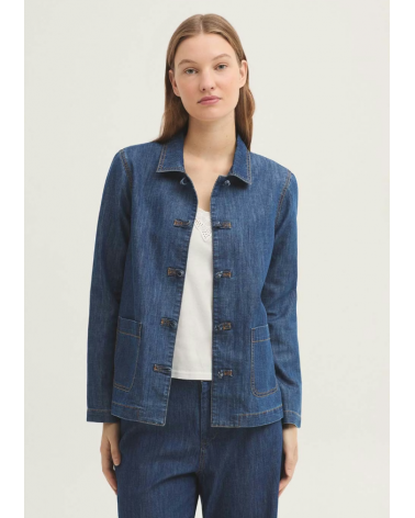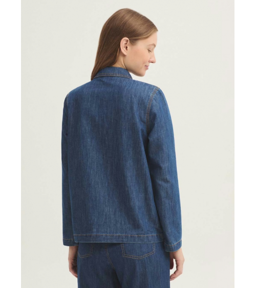 Chaqueta denim confeccionada en mezcla de algodón sostenible. Presenta cuello camisero, bolsillos de parche y cierres chinos del mismo tejido.