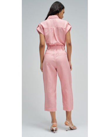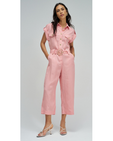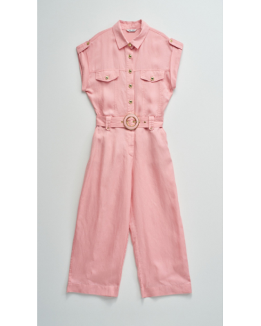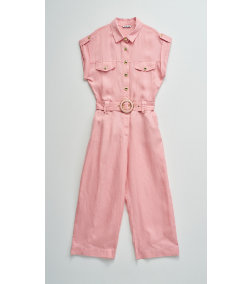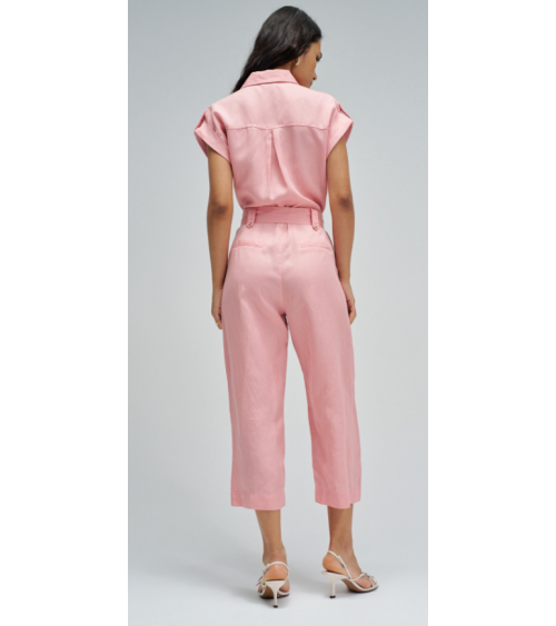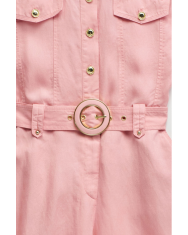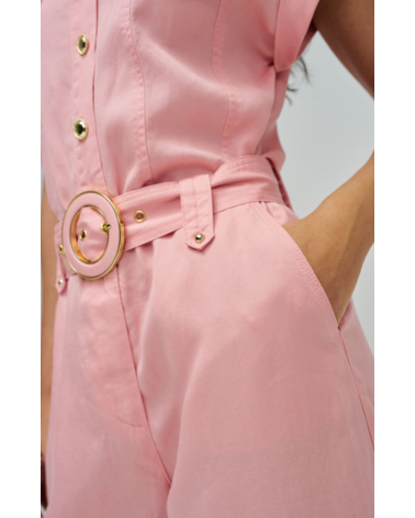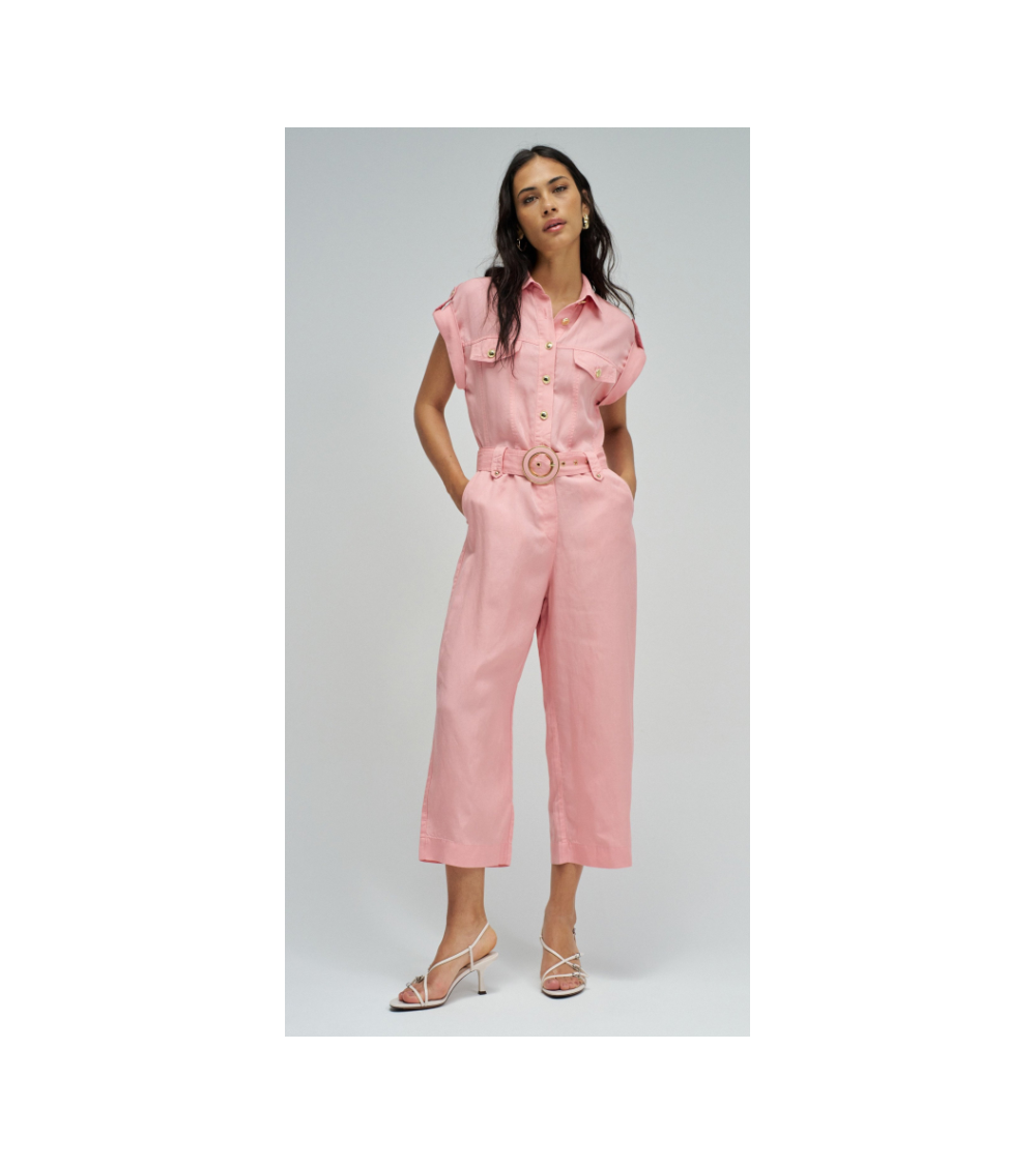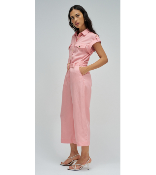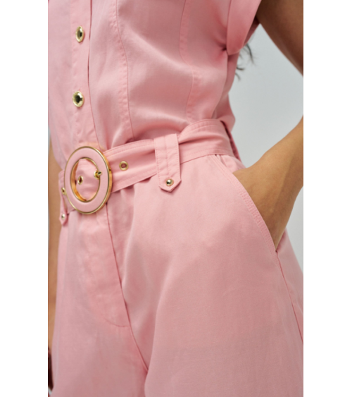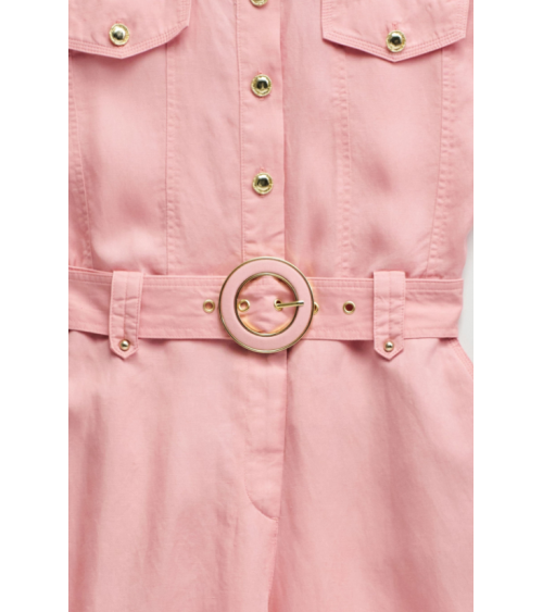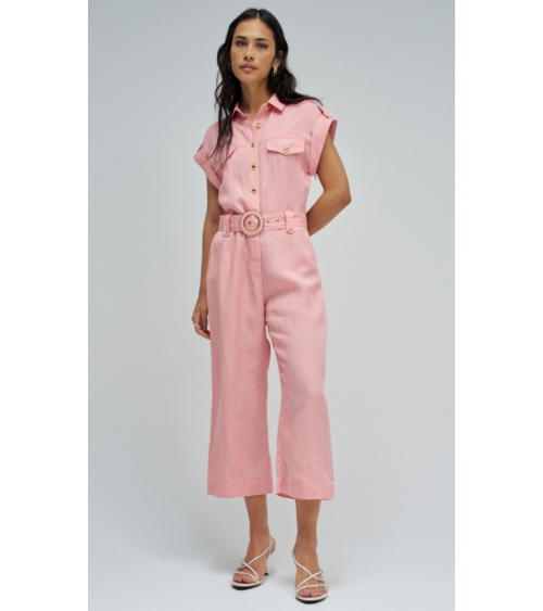 Este mono en lightdenim en color rosa, con escote de cuello y mangas cortas da un toque moderno y casual. Posee pierna cropped slim, apertura frontal con botones y cierre, además de cinturón removible que realza la silueta.