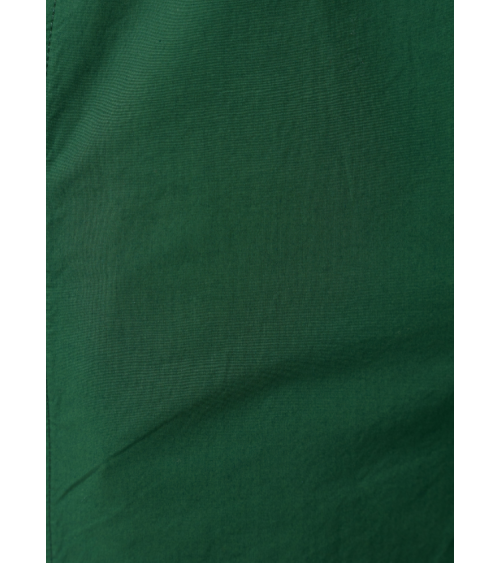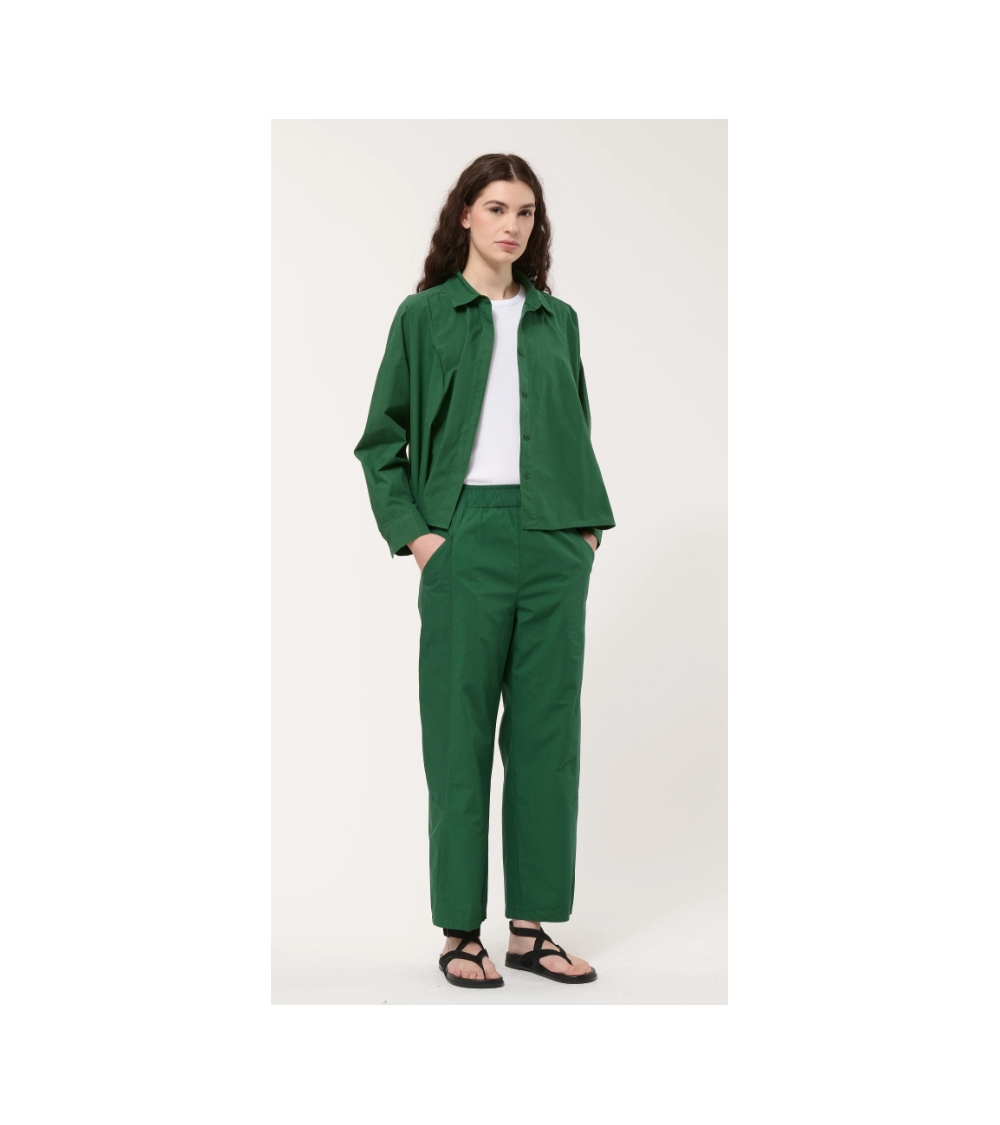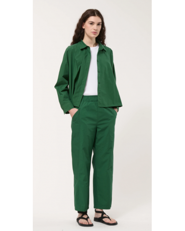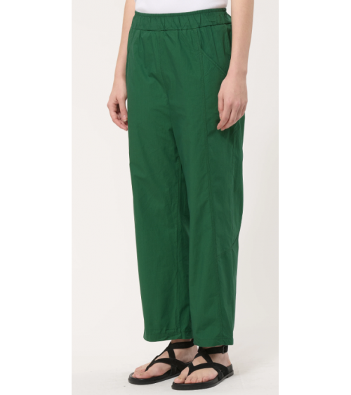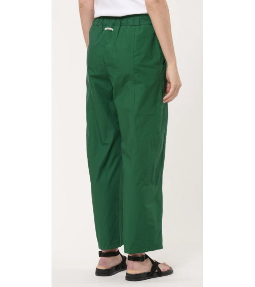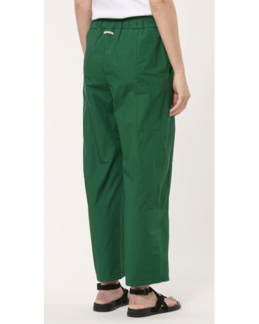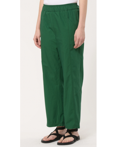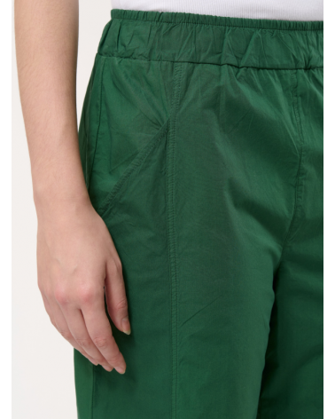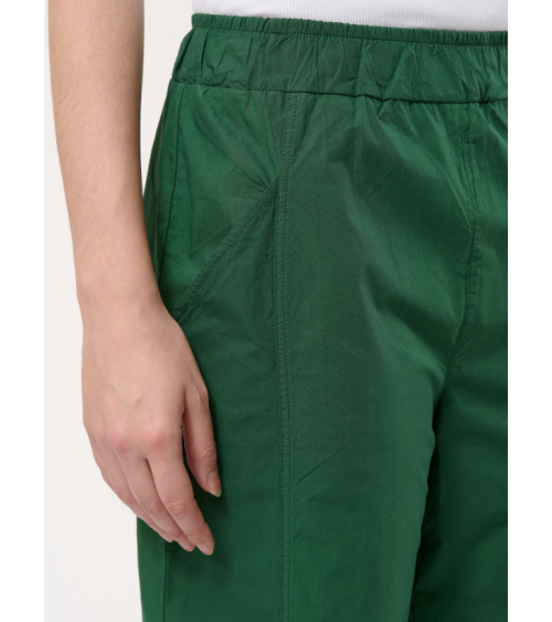 Pantalón verde de popelín de cintura alta elástica y bolsillos laterales inclinados.