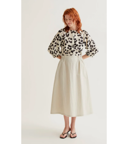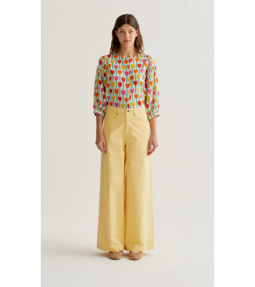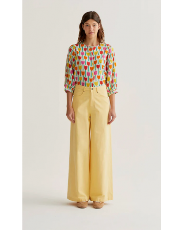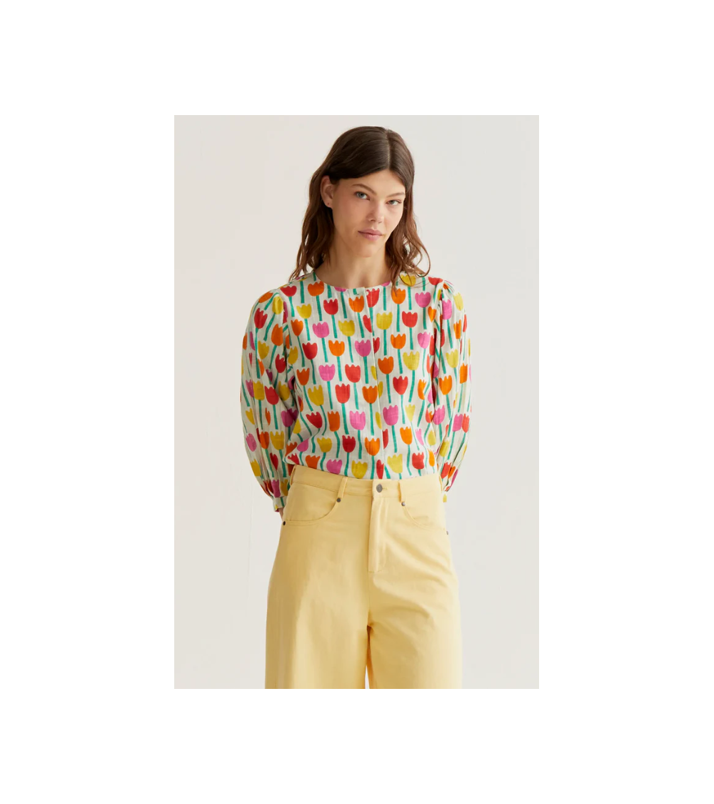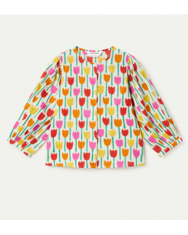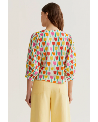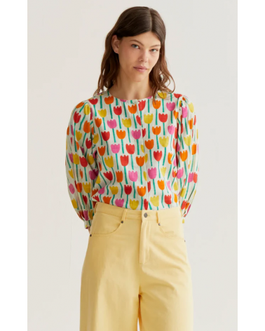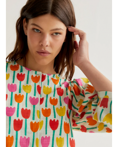 Blusa de tejido 100% algodón con estampado tulipa. Cuello redondo y manga 3/4 ligeramente abullonada.
