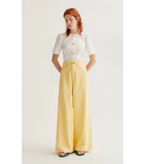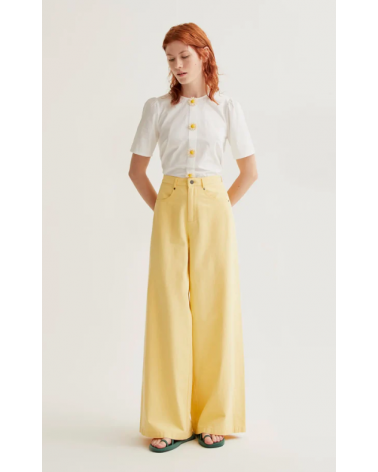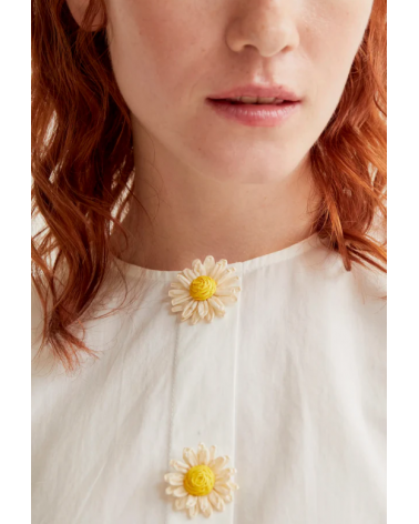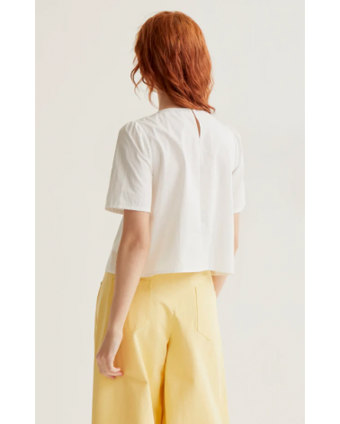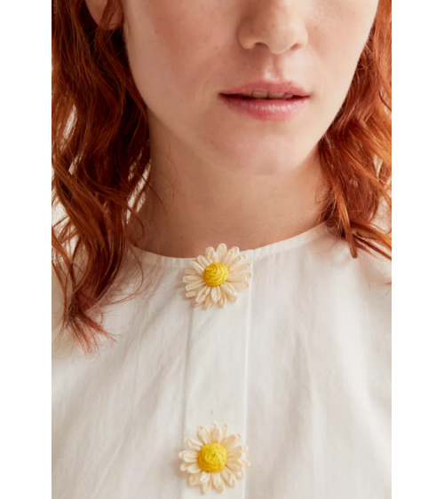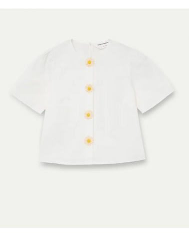 Top de tejido 100% algodón de color blanco. Cuello redondo y manga corta ligeramente abullonada. Cierre frontal con botones ocultos con detalle floral.
