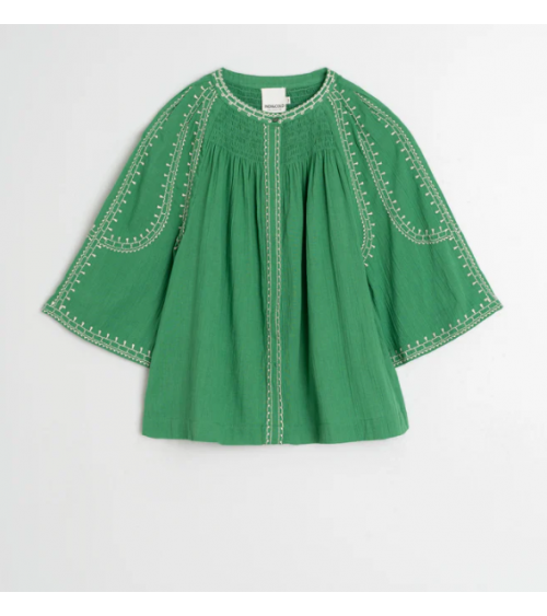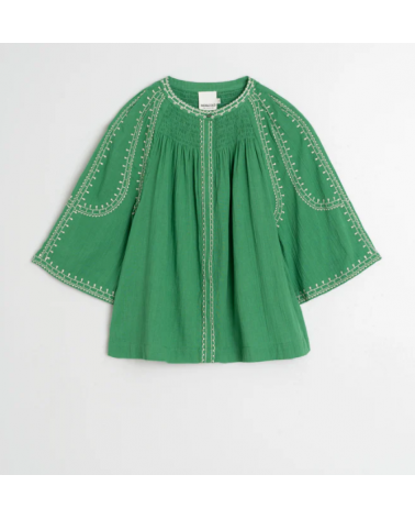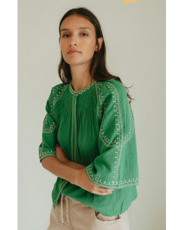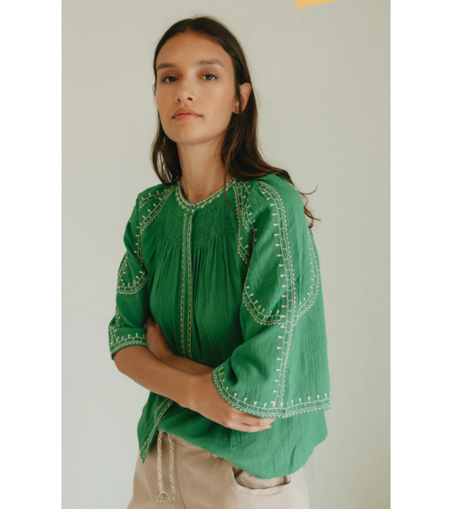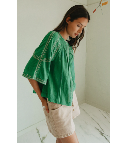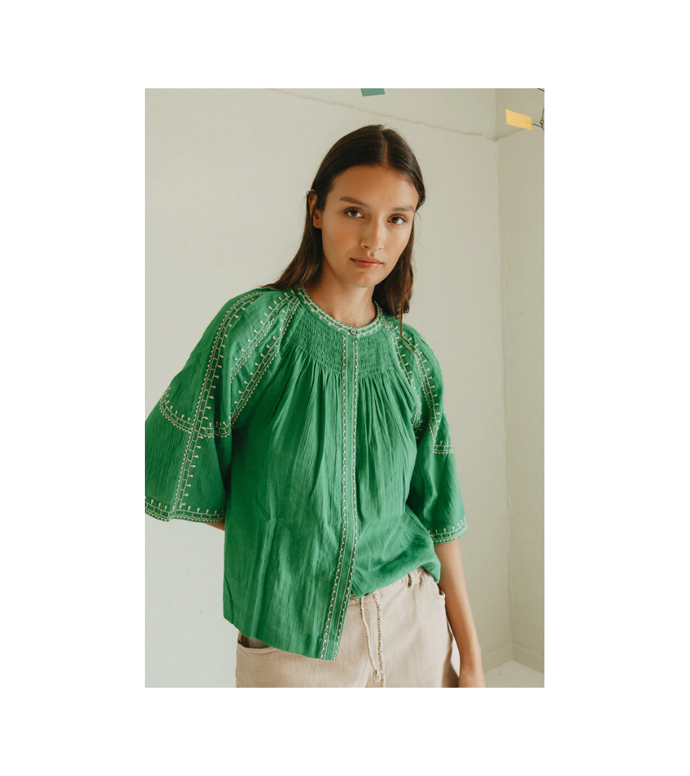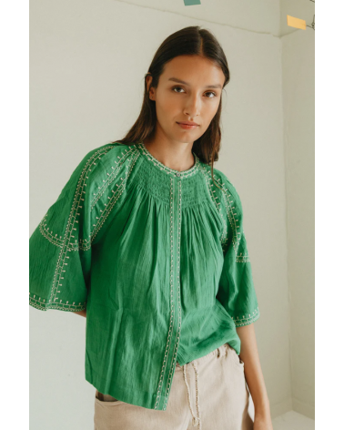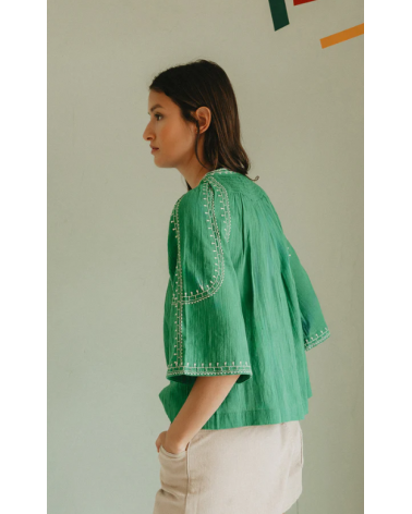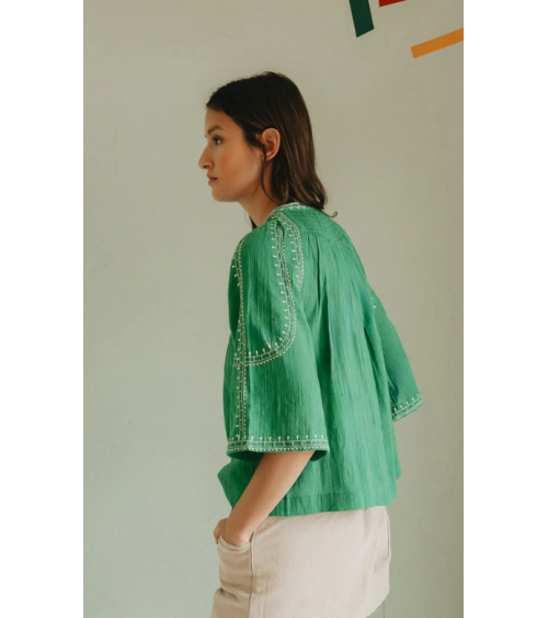 Camisa verde gasa bordado étnico contraste manga campana INDI&COLD
