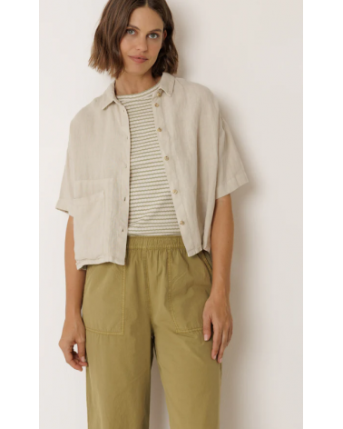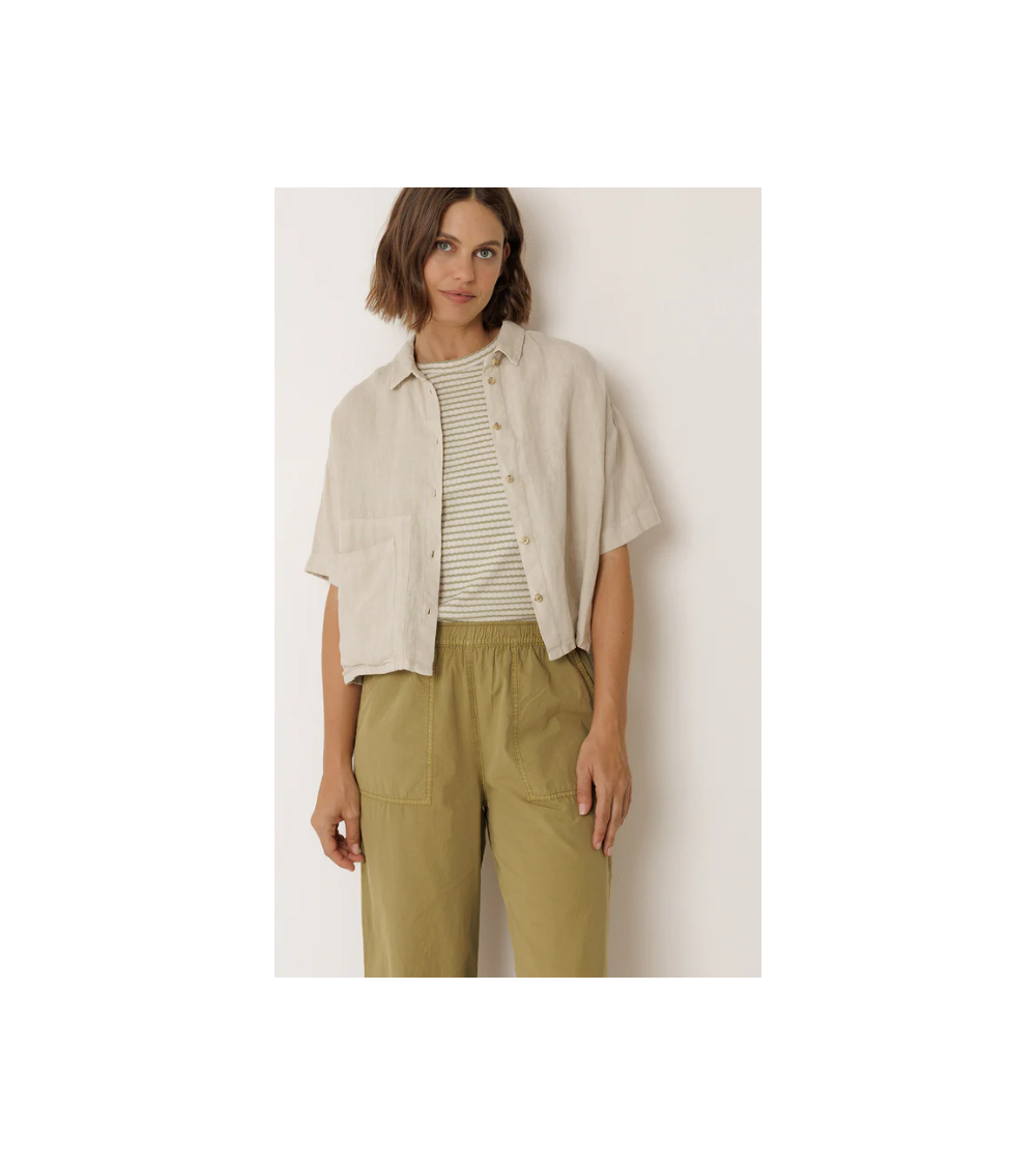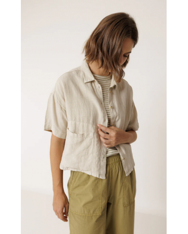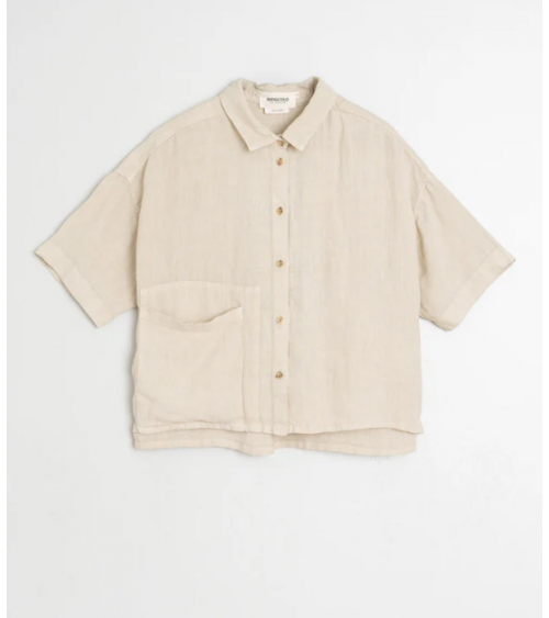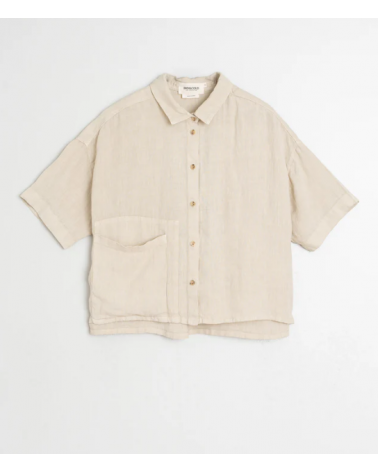Camisa boxy con hombro caído y manga corta. Tiene cierre abotonado y bolsillo de parche en la parte delantera con aberturas laterales que aportan movimiento a la prenda.