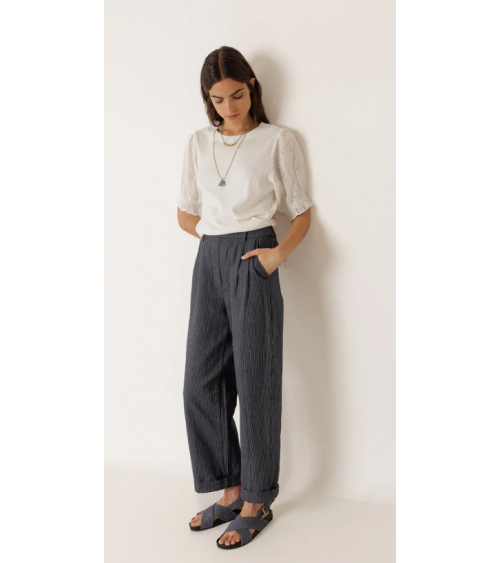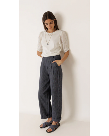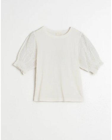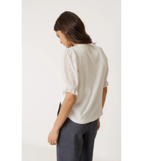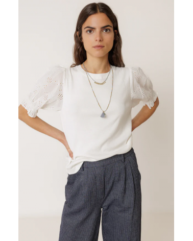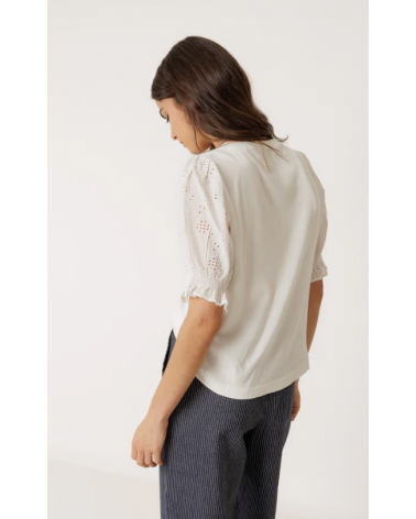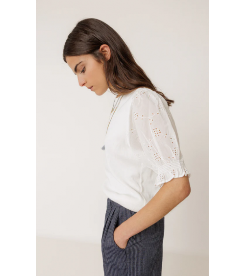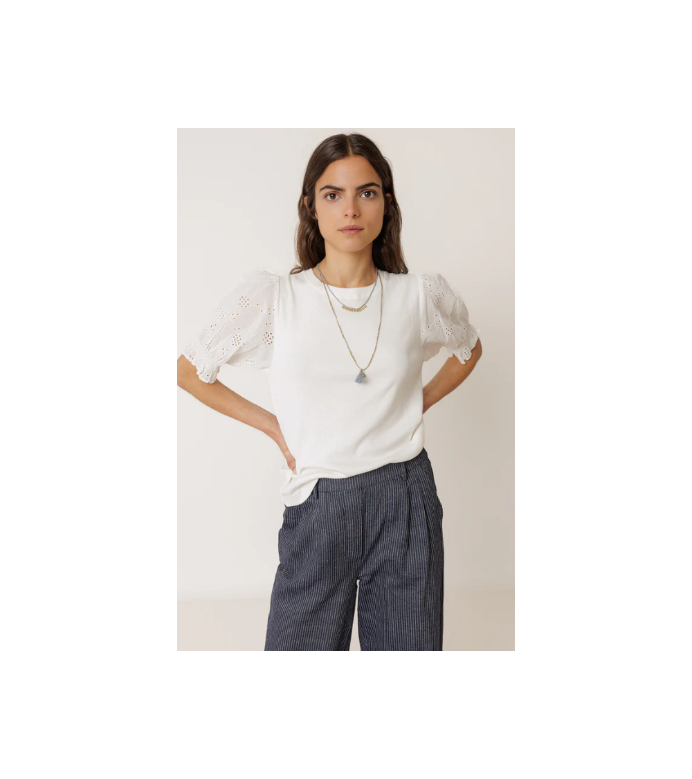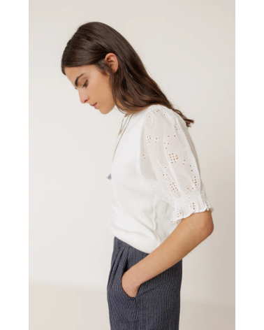 Camiseta blanca canalé mangas abullonadas bordado suizo INDI&COLD