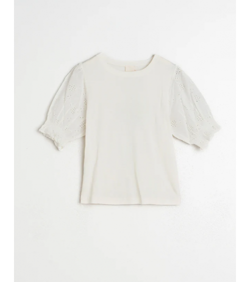Una camiseta especial que combina un canalé de algodón con mangas abullonadas de voile con bordado suizo.