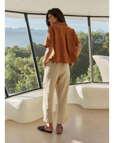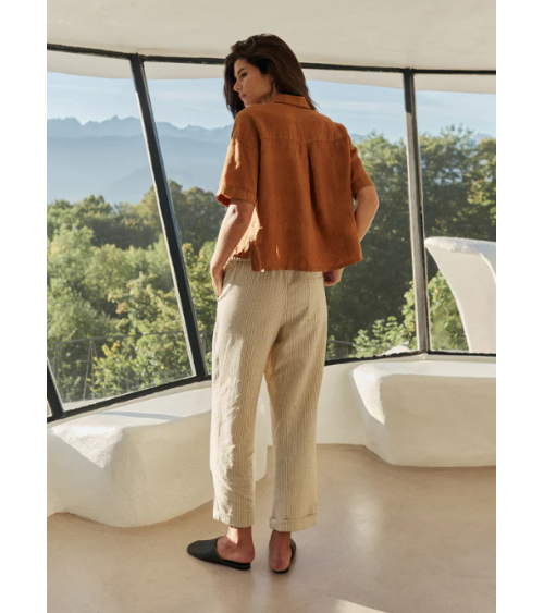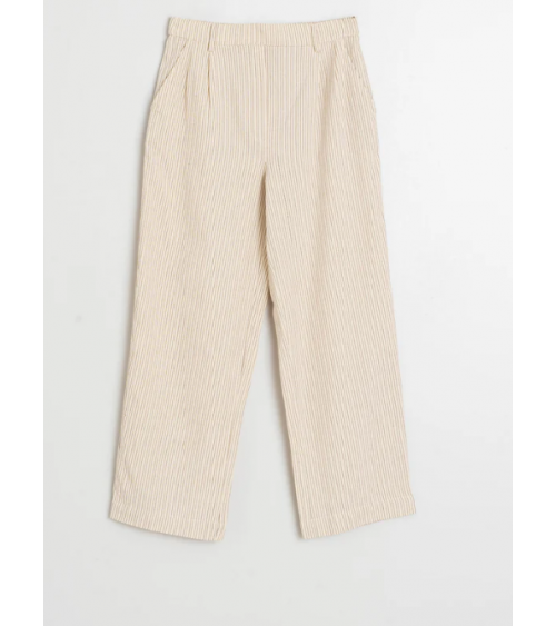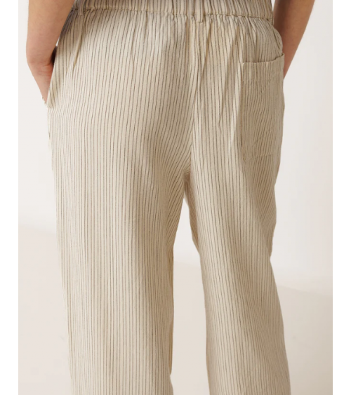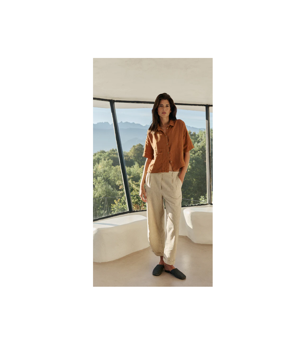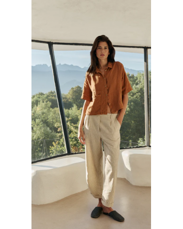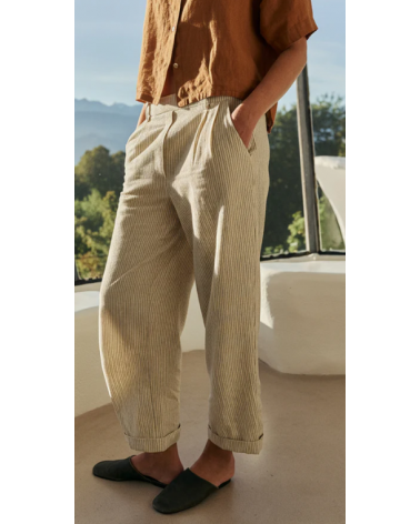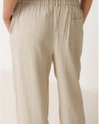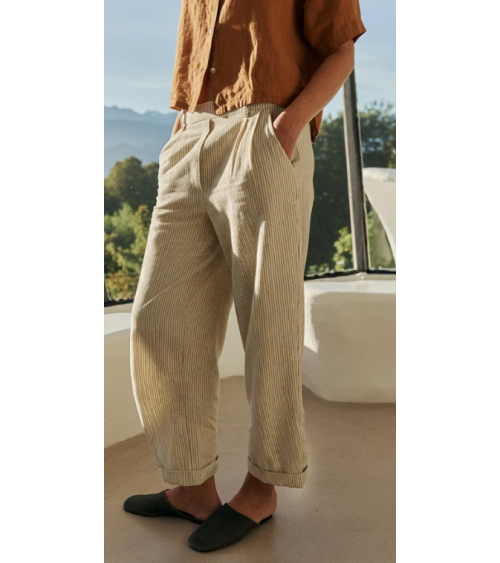 • Cintura alta con engomado en la parte trasera y bolsillo francés. • Pinzas delanteras. • Bolsillo parche trasero. • Tejido rayas en algodón orgánico. • Fit relajado: Diseñado para que siente ligeramente holgado. • Medidas sobre talla S en plano. Cintura: 34cm. Largo de tiro: 30,5cm. Largo de entrepierna: 75cm.
