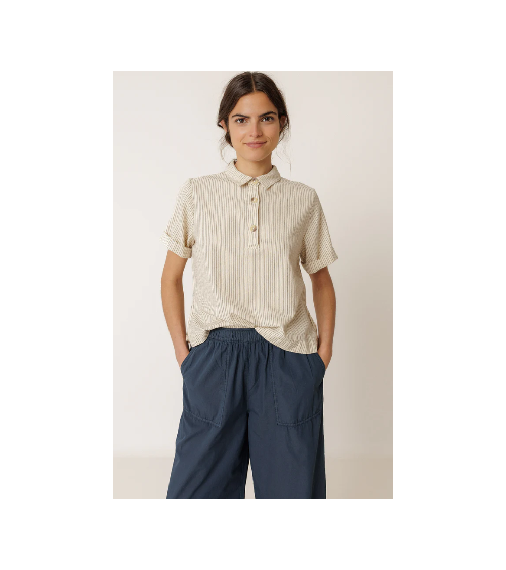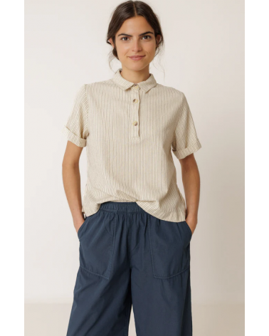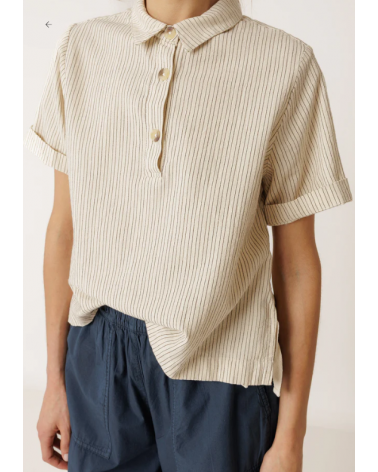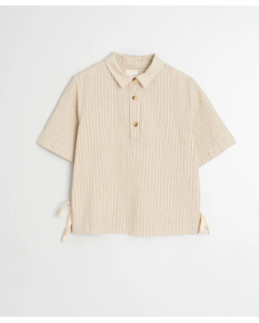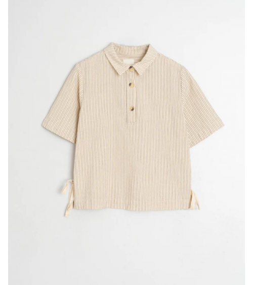 • Cuello polo con cierre de botones. • Manga corta y aberturas laterales con lazada. • Tejido de rayas en algodón orgánico. • Box fit: Diseñado con un corte cuadrado, ancho y corto. • Medidas sobre talla S en plano: Largo desde hombro 58cm. Ancho de pecho 52cm. Ancho de bajo 55cm. Tallaje: +1 cm de largo por talla y +2cm en contornos.