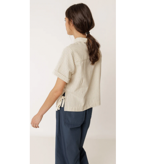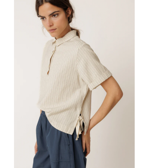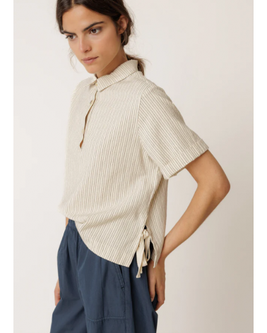 Esta camisa de raya diplomática con cuello polo, está confeccionada en algodón orgánico. Las aberturas laterales con lazada le dan un aire nuevo a la camisa tradicional.