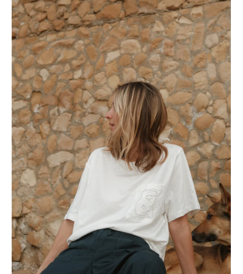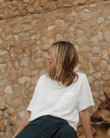 Camiseta de hombro ligeramente caído, cuello redondo y manga corta. Detalle de anagrama bordado en el bolsillo.