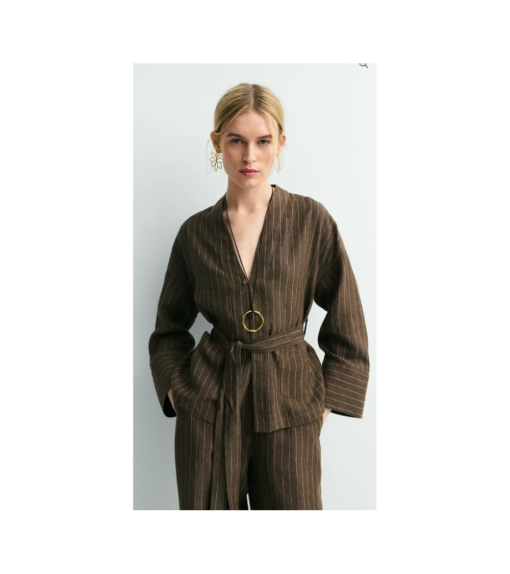El kimono Yukata es una prenda de fitting relajado confeccionada en 100% lino, un tejido natural y ligero en tono marrón con rayas. Diseñado con cierre central de dos botones y cinturón extraíble del mismo tejido, permite ajustar la silueta y adaptarse a diferentes estilos. Incorpora dos bolsillos delanteros.