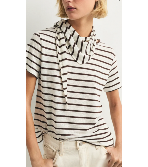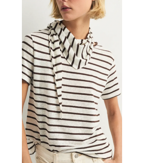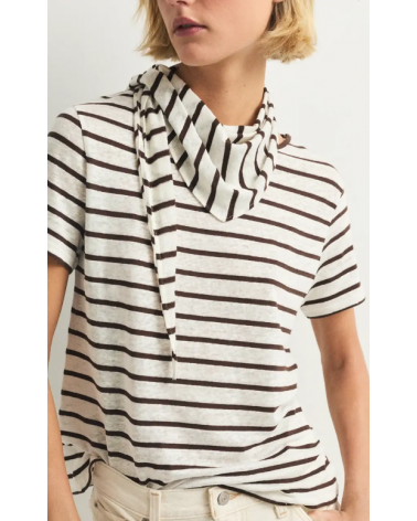 La toquilla Begur es un accesorio ligero y versátil. Con estampado de rayas marrones y ecru, aporta un toque fresco y elegante a cualquier conjunto. Confeccionada en mezcla de lino y algodón. Con camiseta a conjunto de venta por separado.
