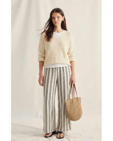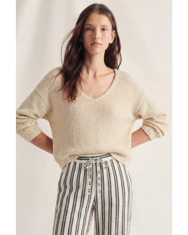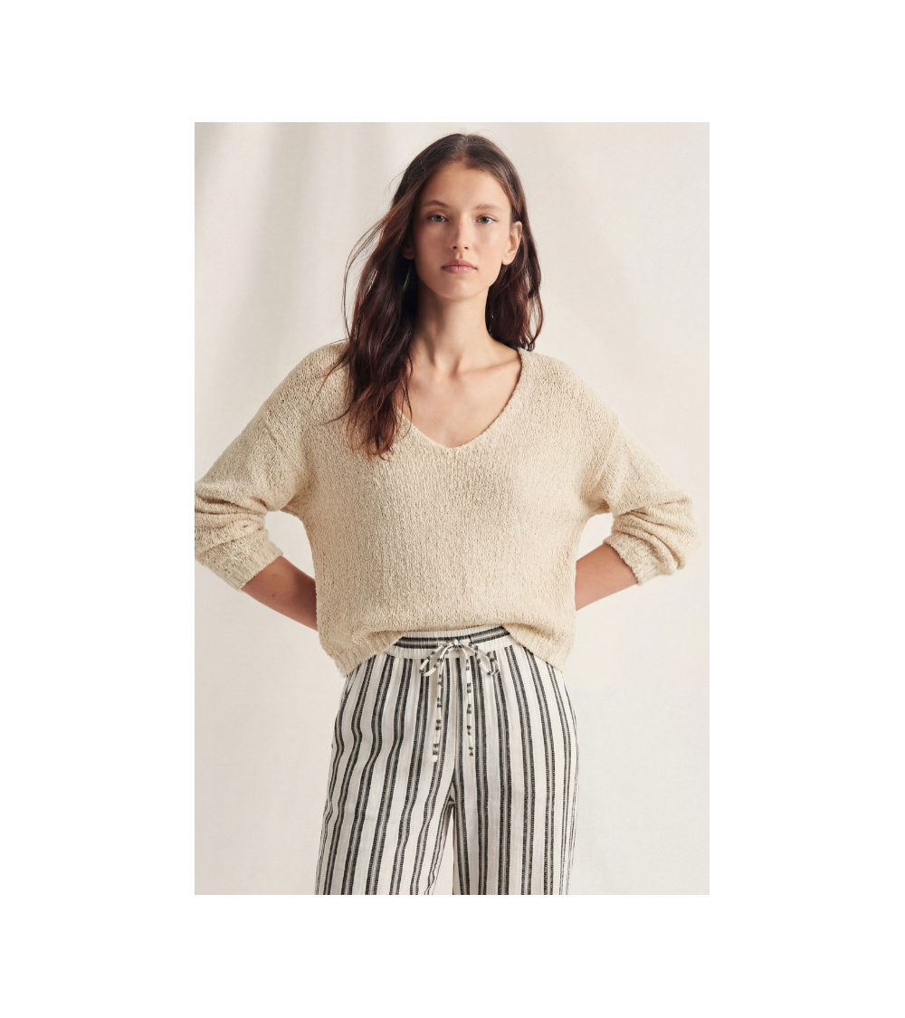Jersey de punto con escote en pico y manga larga. Confeccionado en un tejido rústico semi abierto.