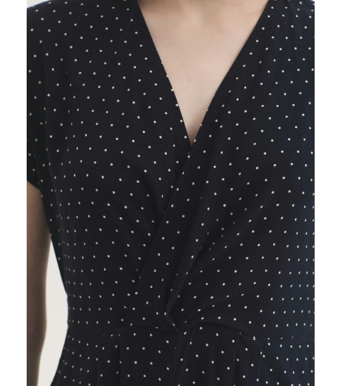 Vestido largo estampado Small Dots. Escote pico cruzado. Bolsillos laterales. Cremallera invisible y abertura con botón en la parte trasera. Manga corta. Falda evasé.