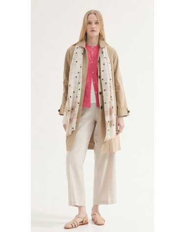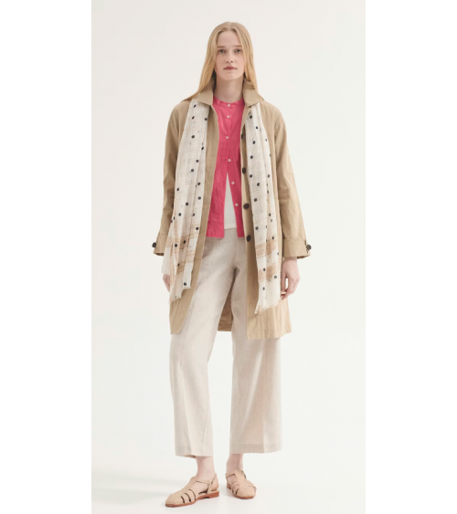 Camisa en tejido voile de algodón sostenible, con cuello mao, botonadura frontal de nácar, frunces en los hombros y manga francesa abullonada con abertura, puño y botón.