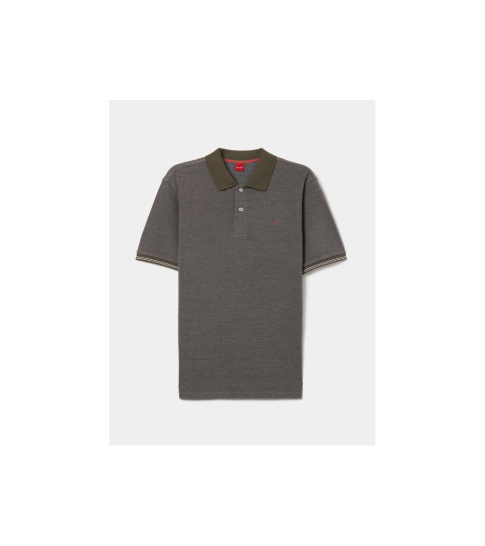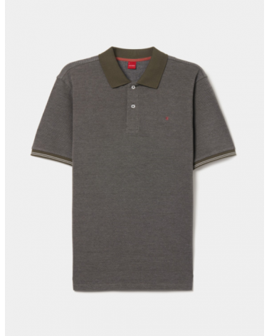 Polo de manga corta confeccionado en punto de algodón. Presenta cuello y puños en color contrastante, con rayas blancas en los puños.